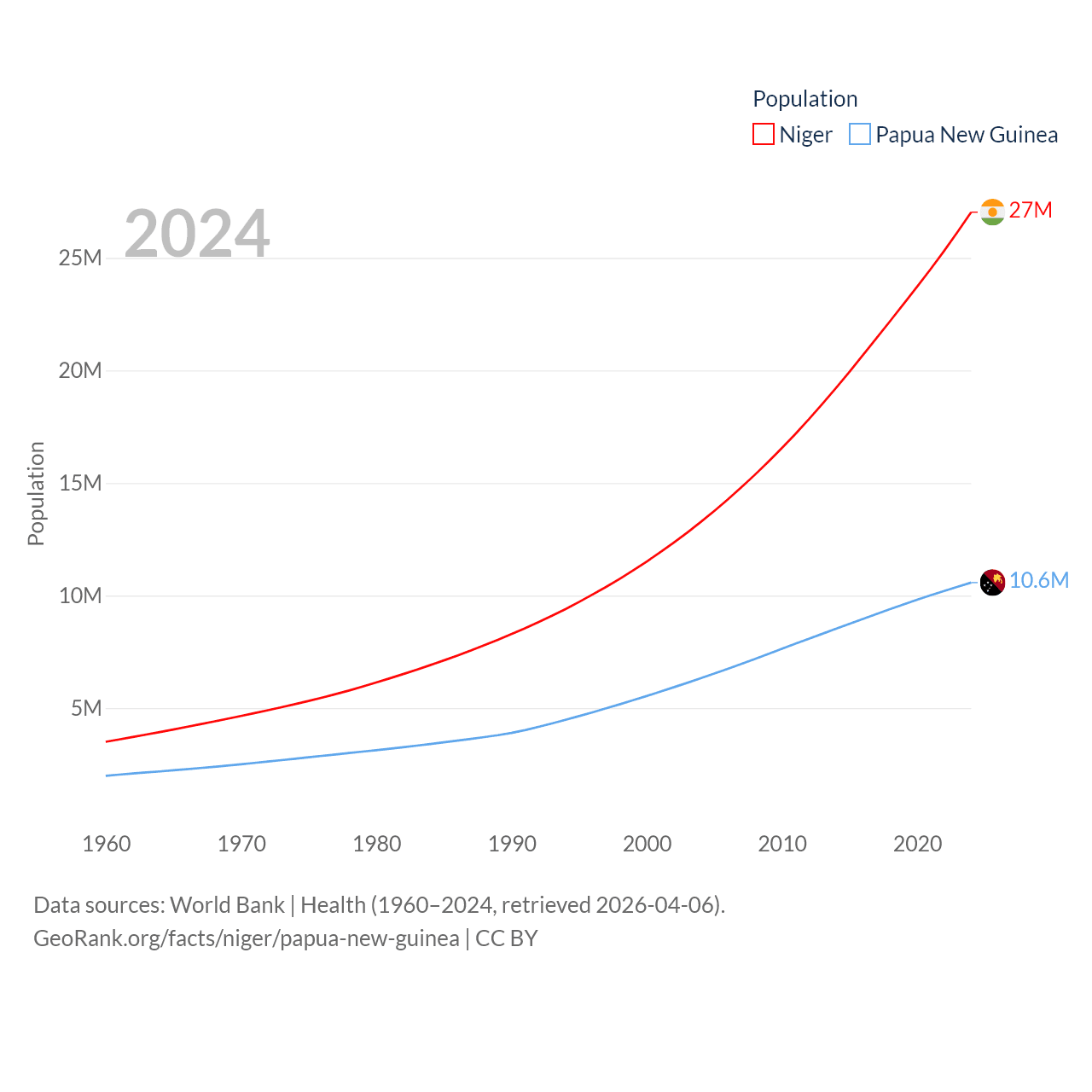 Niger has a population of 27M (ranked 55/197), compared with 10.6M in Papua New Guinea (ranked 92/197). Niger's land area is 489,076 sq mi versus 174,850 sq mi for Papua New Guinea (ranked 20th vs. 54th).