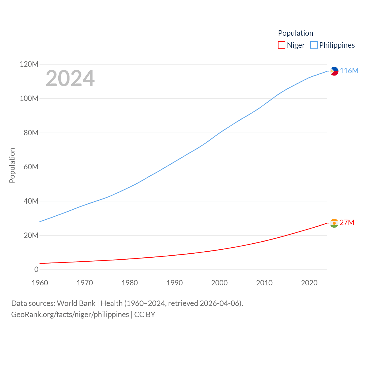 Niger has a population of 27M (ranked 55/197), compared with 116M in The Philippines (ranked 14/197). Niger's land area is 489,076 sq mi versus 115,124 sq mi for The Philippines (ranked 20th vs. 71st).