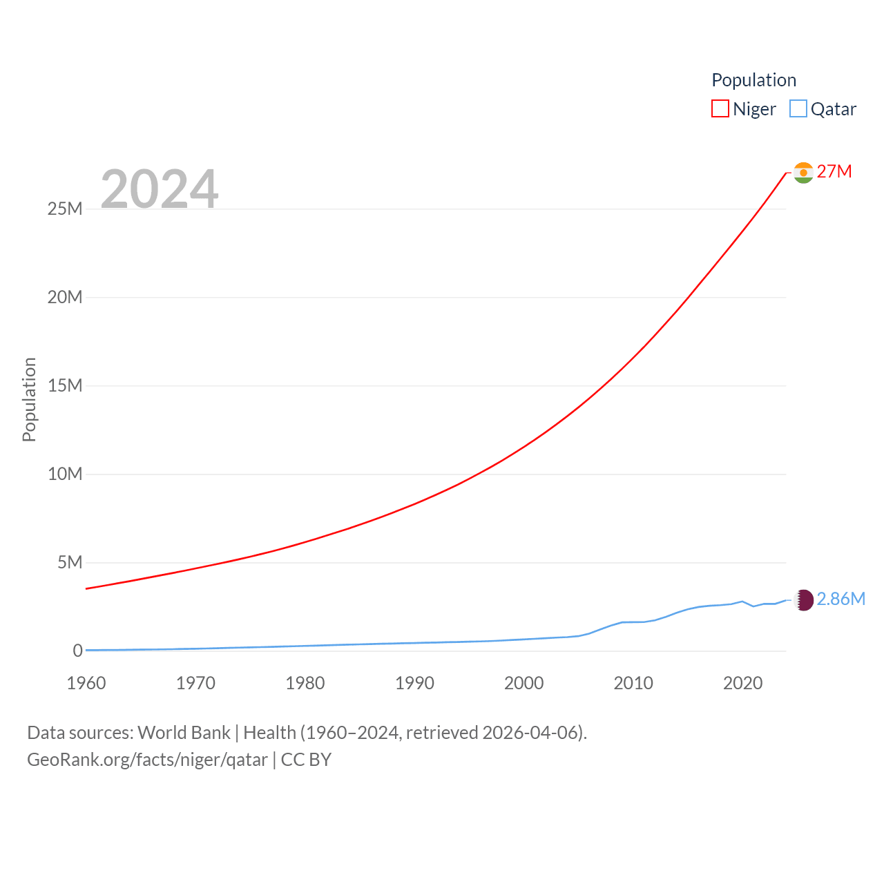 Niger has a population of 27M (ranked 55/197), compared with 2.86M in Qatar (ranked 138/197). Niger's land area is 489,076 sq mi versus 4,436 sq mi for Qatar (ranked 20th vs. 158th).
