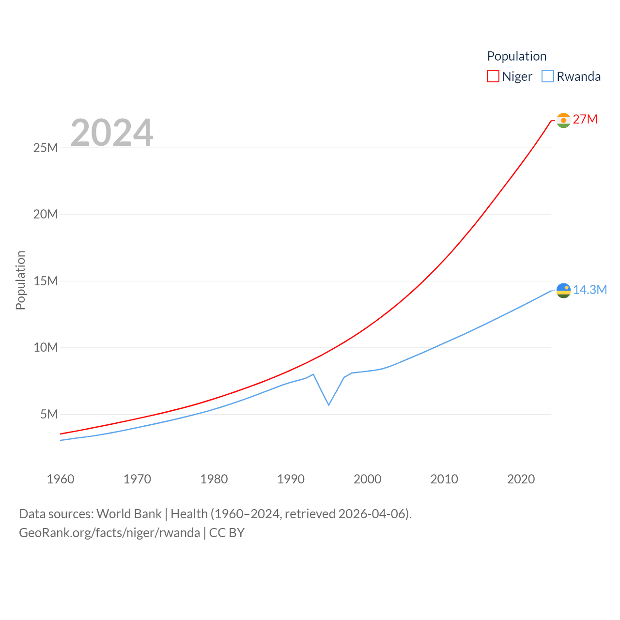 Niger has a population of 27M (ranked 55/197), compared with 14.3M in Rwanda (ranked 77/197). Niger's land area is 489,076 sq mi versus 9,525 sq mi for Rwanda (ranked 20th vs. 146th).