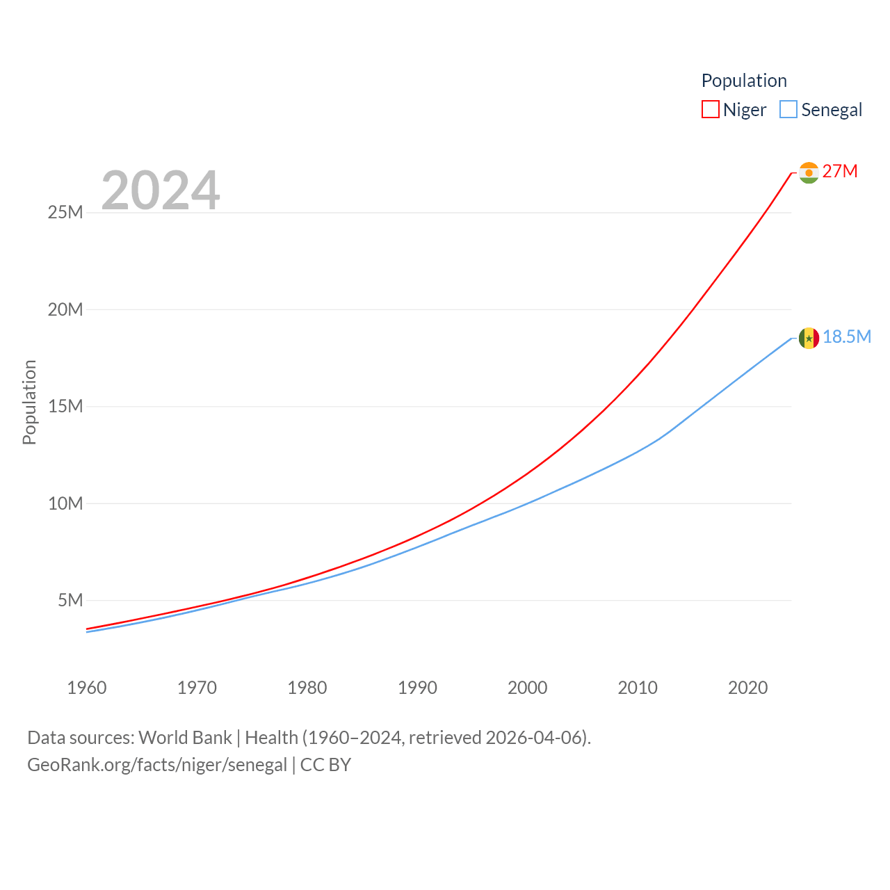 Niger has a population of 27M (ranked 55/197), compared with 18.5M in Senegal (ranked 69/197). Niger's land area is 489,076 sq mi versus 74,336 sq mi for Senegal (ranked 20th vs. 85th).