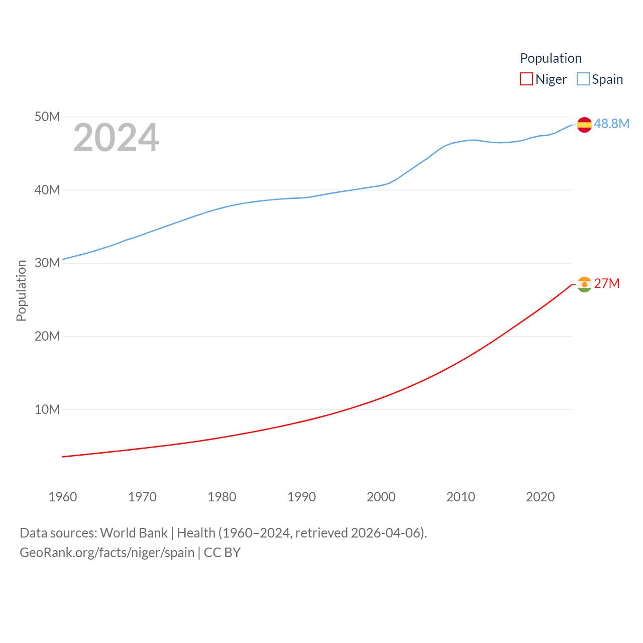 Niger has a population of 27M (ranked 55/197), compared with 48.8M in Spain (ranked 32/197). Niger's land area is 489,076 sq mi versus 192,934 sq mi for Spain (ranked 20th vs. 51st).