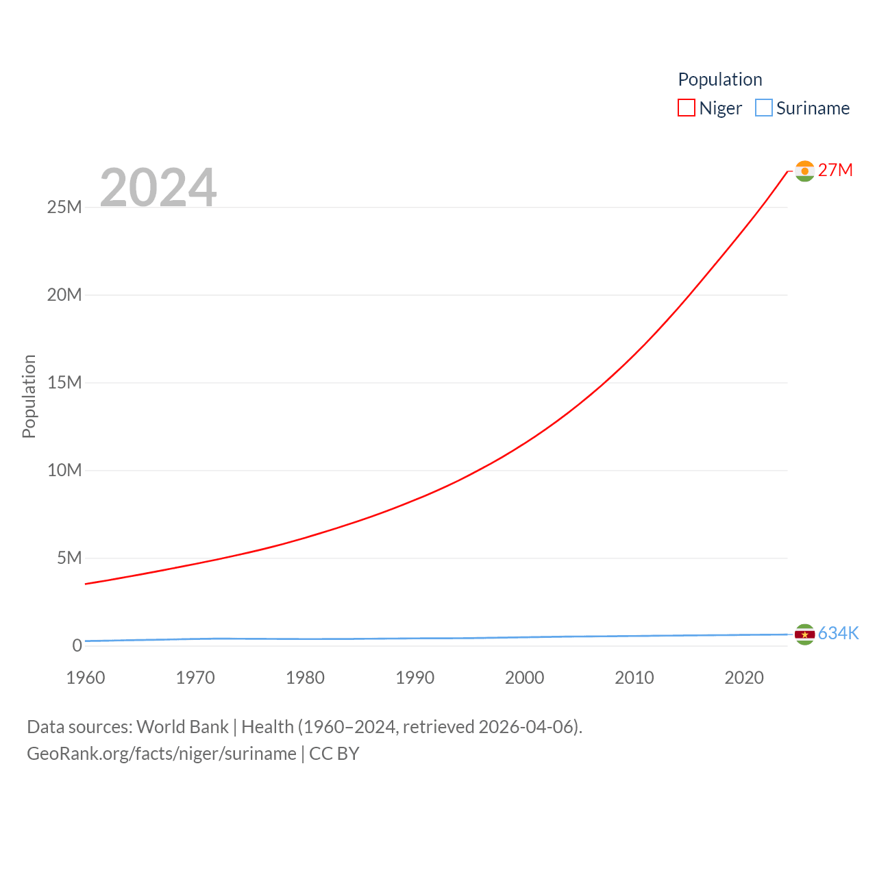Niger has a population of 27M (ranked 55/197), compared with 634K in Suriname (ranked 165/197). Niger's land area is 489,076 sq mi versus 61,972 sq mi for Suriname (ranked 20th vs. 90th).