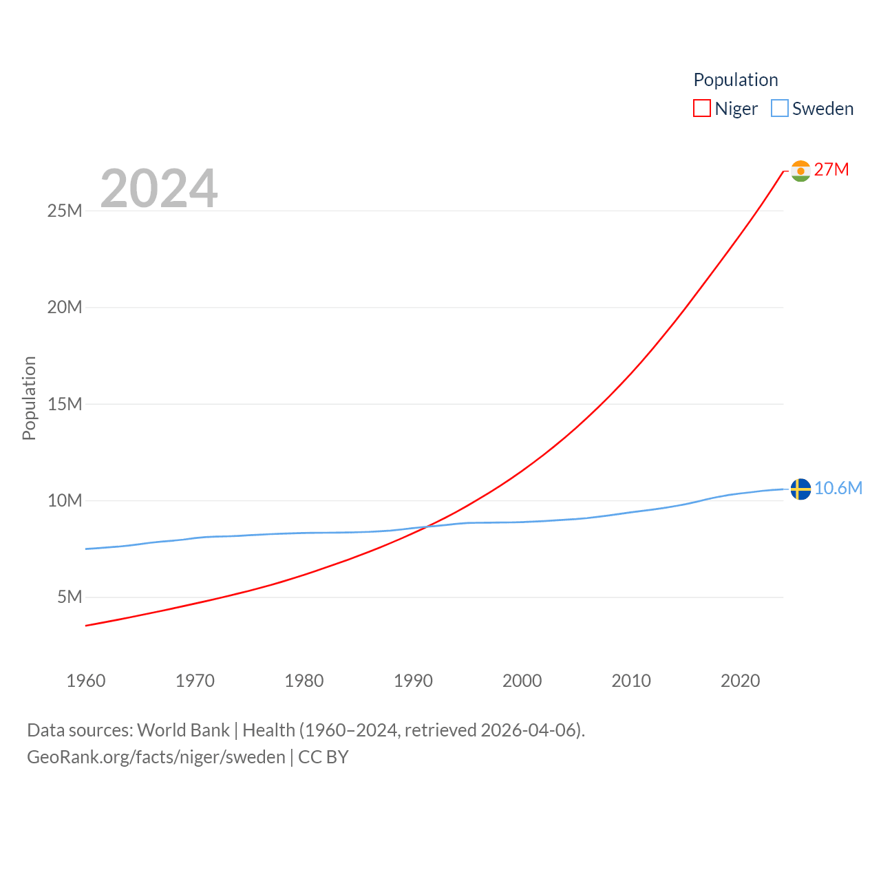 Niger has a population of 27M (ranked 55/197), compared with 10.6M in Sweden (ranked 93/197). Niger's land area is 489,076 sq mi versus 157,248 sq mi for Sweden (ranked 20th vs. 58th).