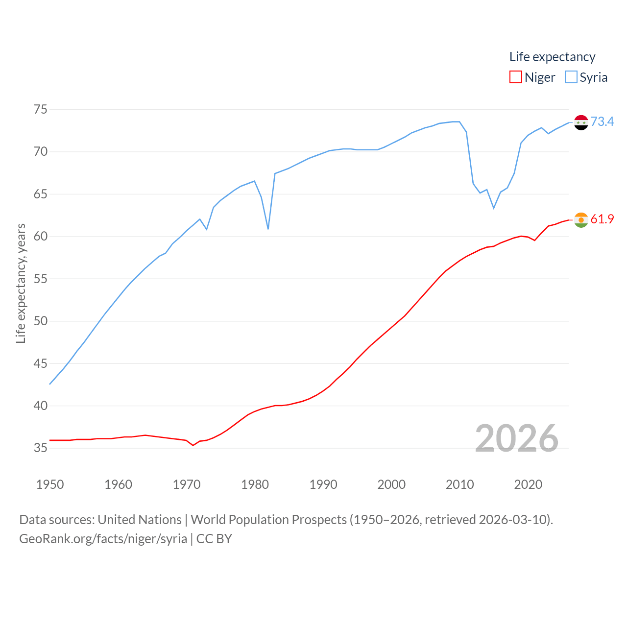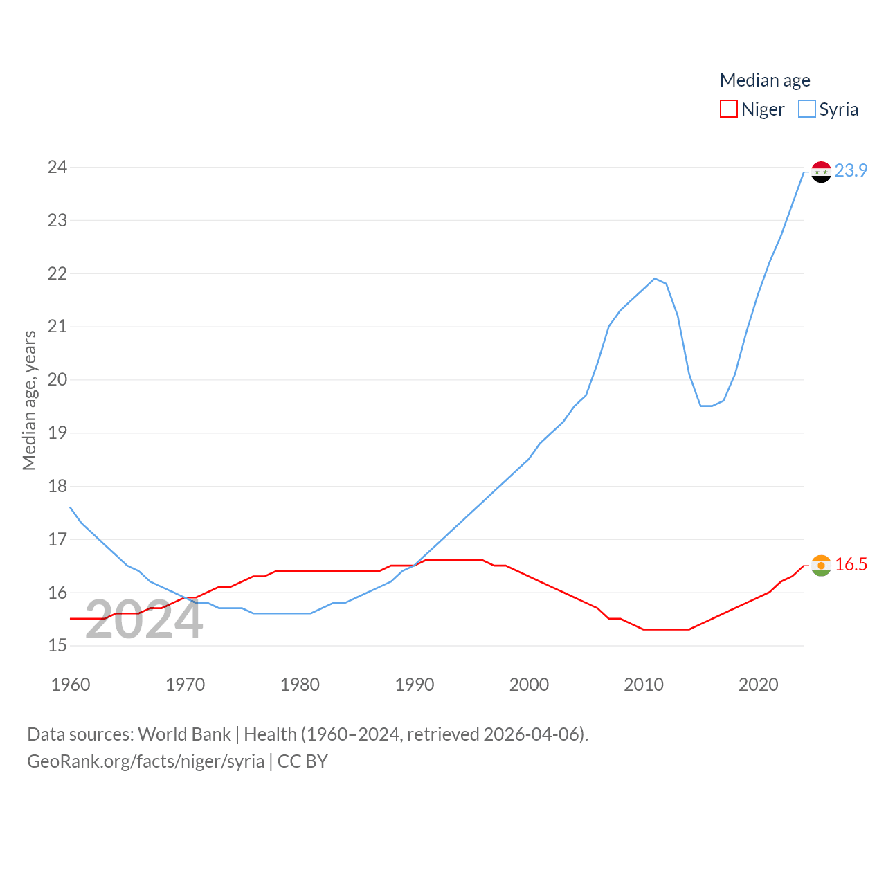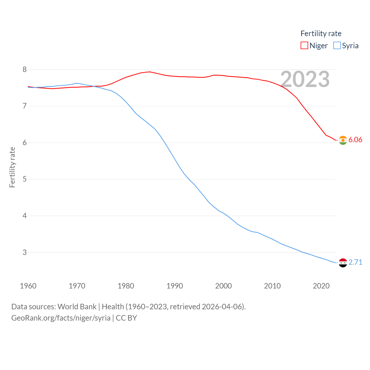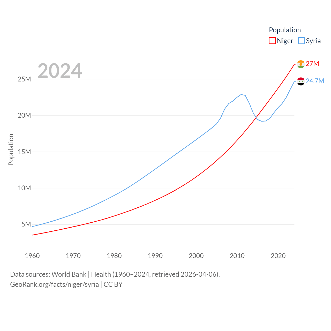Niger has a population of 27M (ranked 55/197), compared with 24.7M in Syria (ranked 57/197). Niger's land area is 489,076 sq mi versus 70,900 sq mi for Syria (ranked 20th vs. 87th).