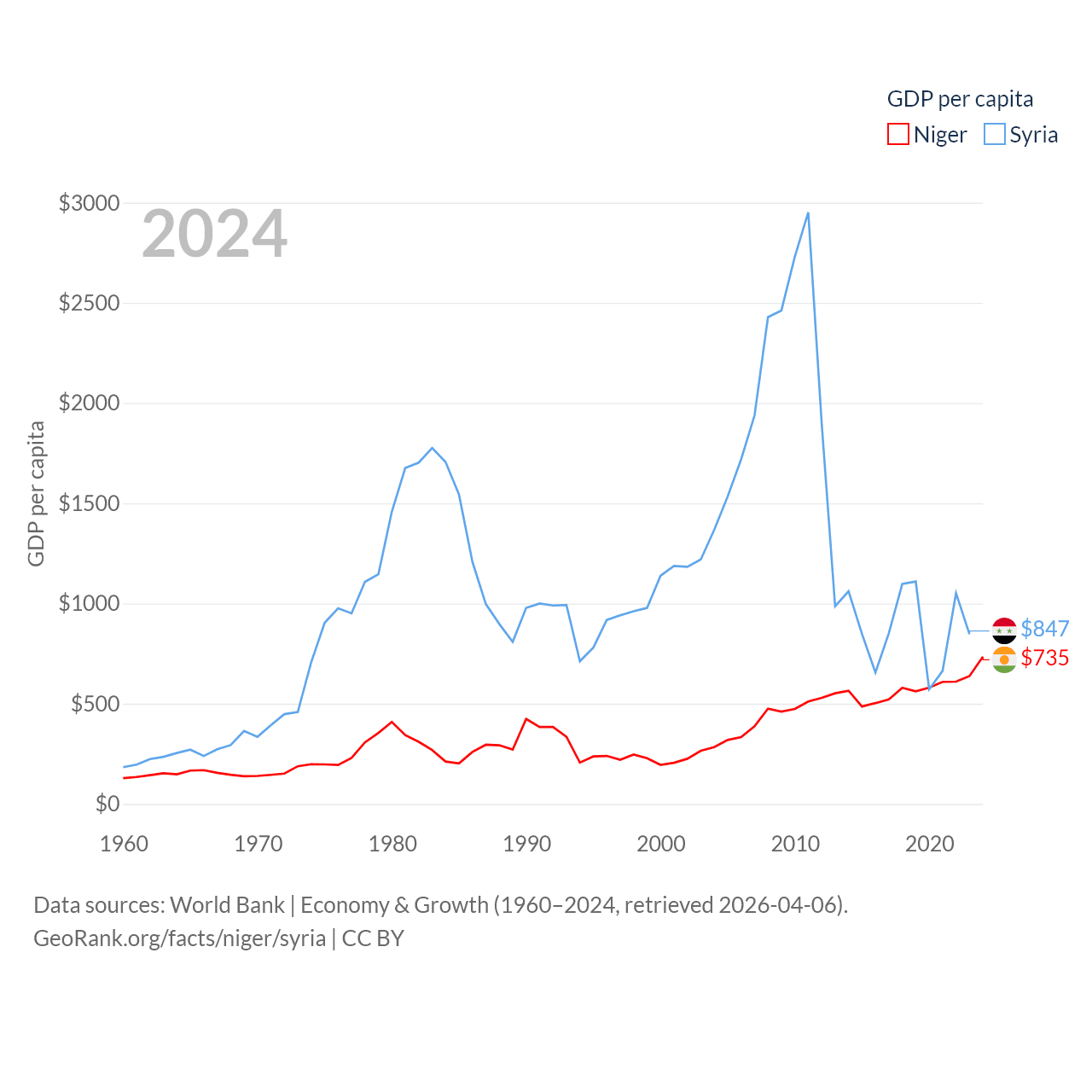 By GDP, Niger ranks 130/197 ($19.9B) and Syria ranks 129/197 ($20B). By GDP per capita, Niger ranks 187/197 ($735), while Syria ranks 185/197 ($847).