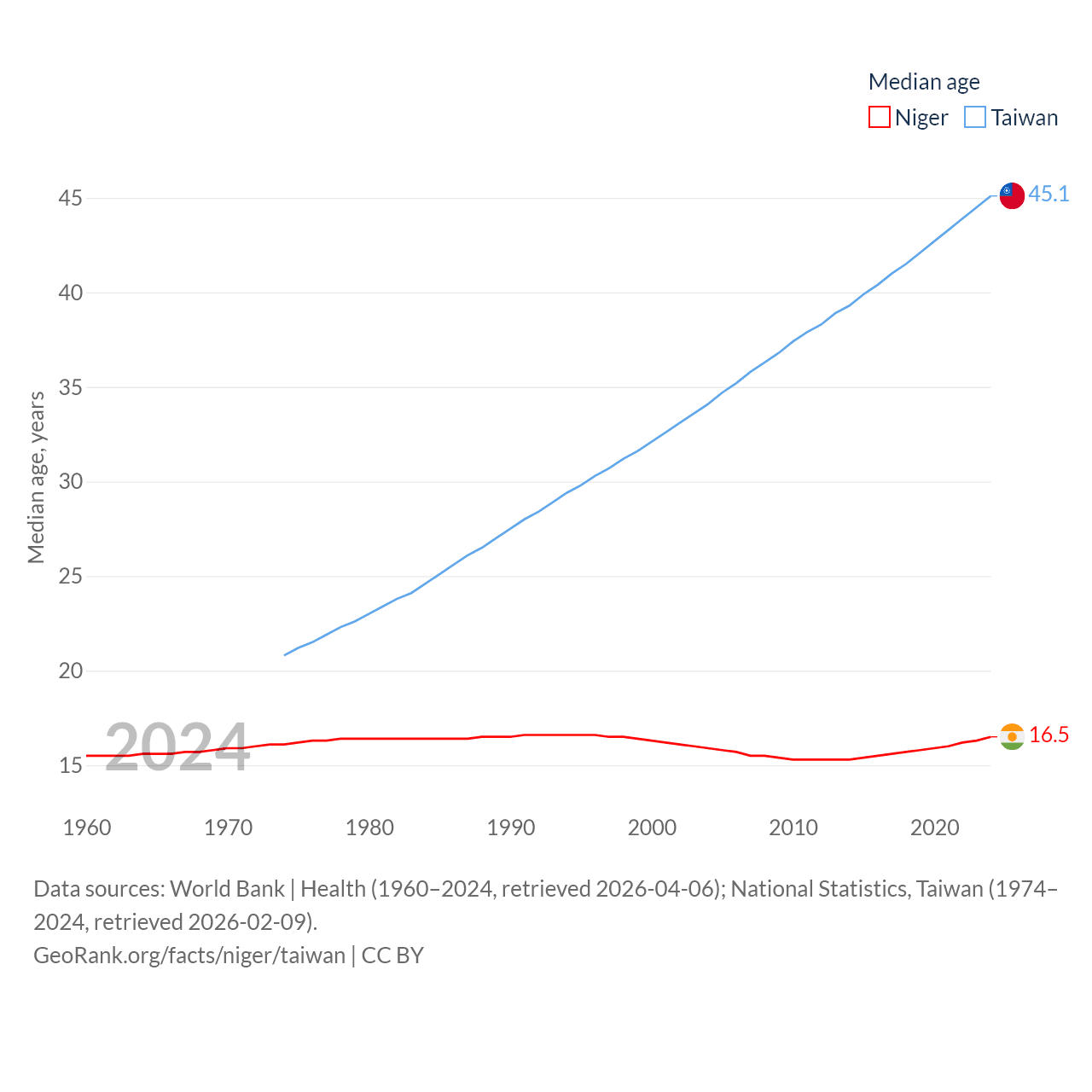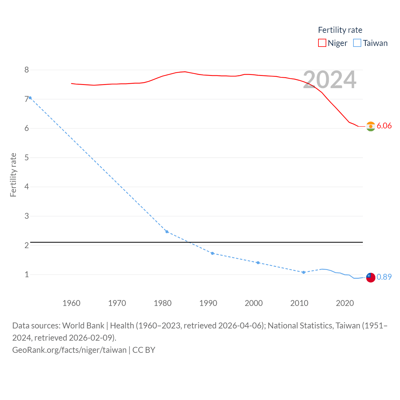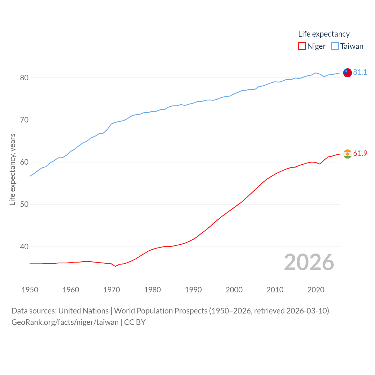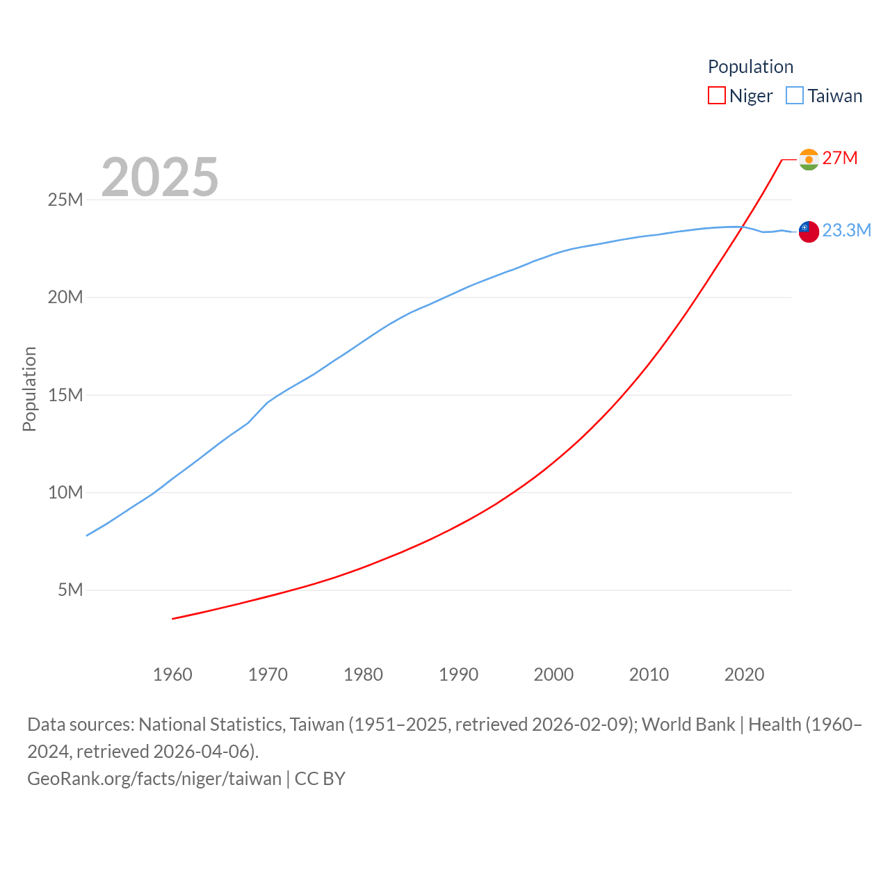 Niger has a population of 27M (ranked 55/197), compared with 23.3M in Taiwan (ranked 60/197). Niger's land area is 489,076 sq mi versus 13,976 sq mi for Taiwan (ranked 20th vs. 133rd).