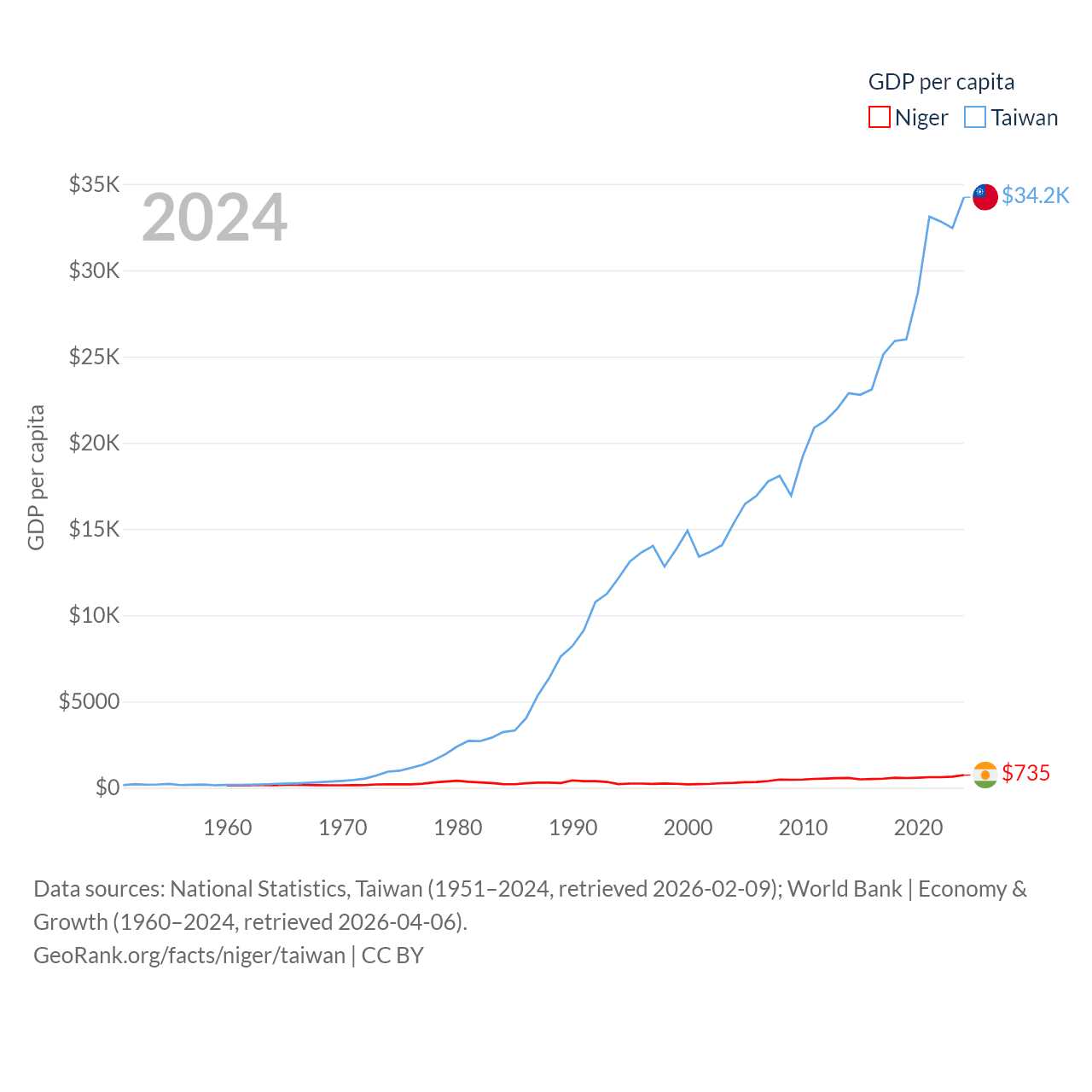 By GDP, Niger ranks 130/197 ($19.9B) and Taiwan ranks 22/197 ($802B). By GDP per capita, Niger ranks 187/197 ($735), while Taiwan ranks 35/197 ($34,238).