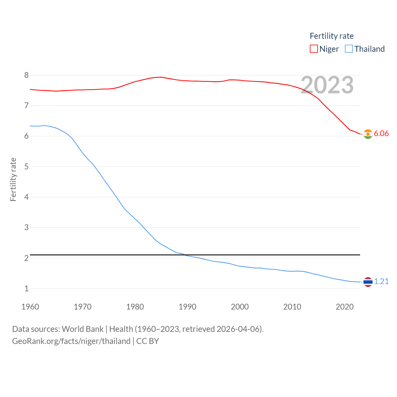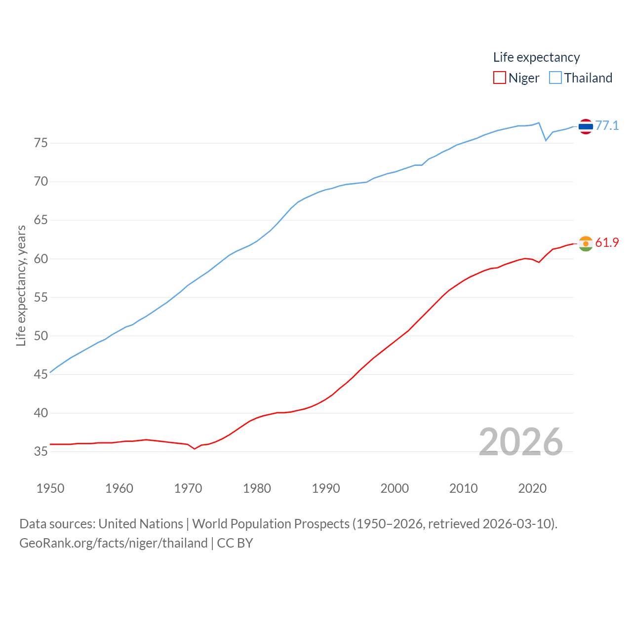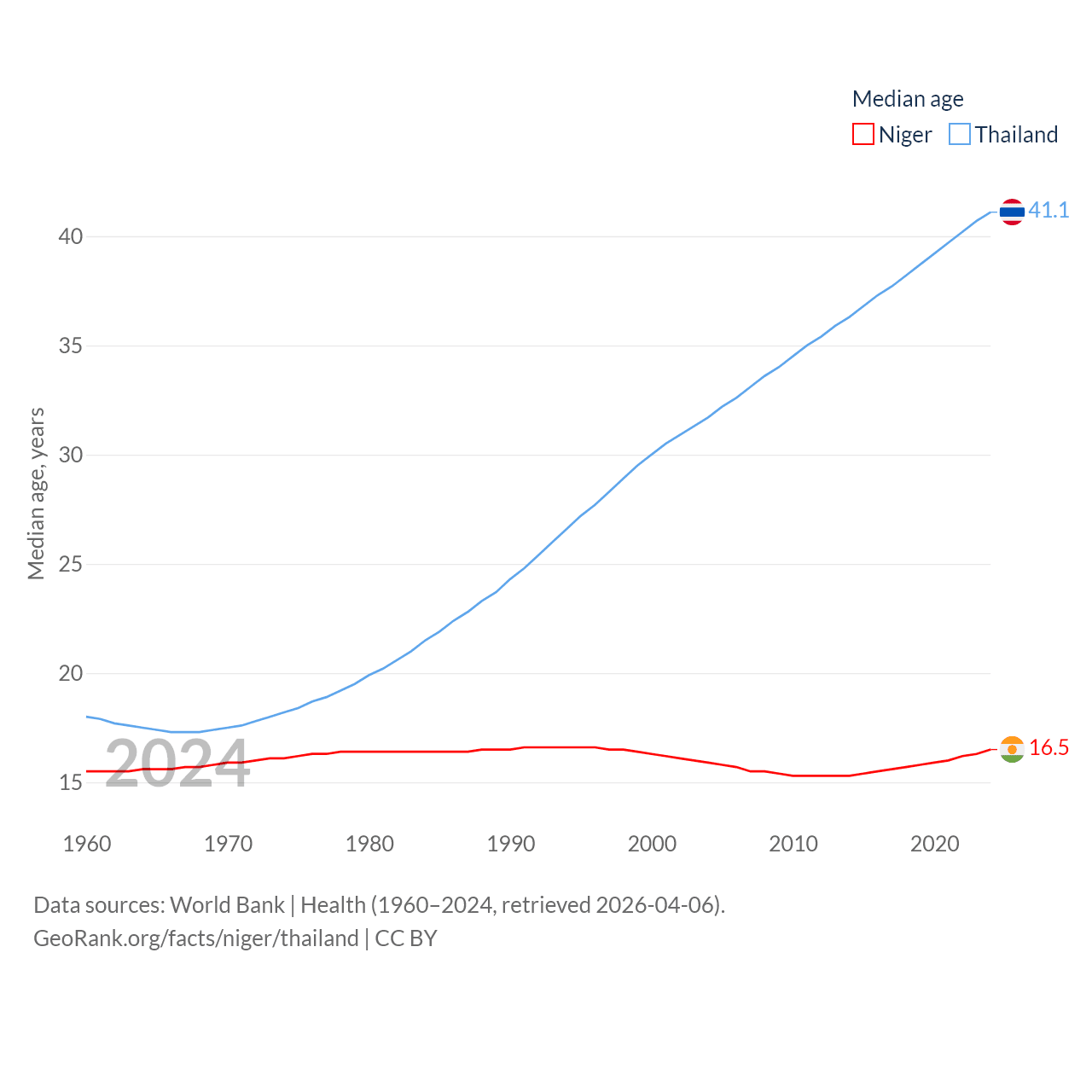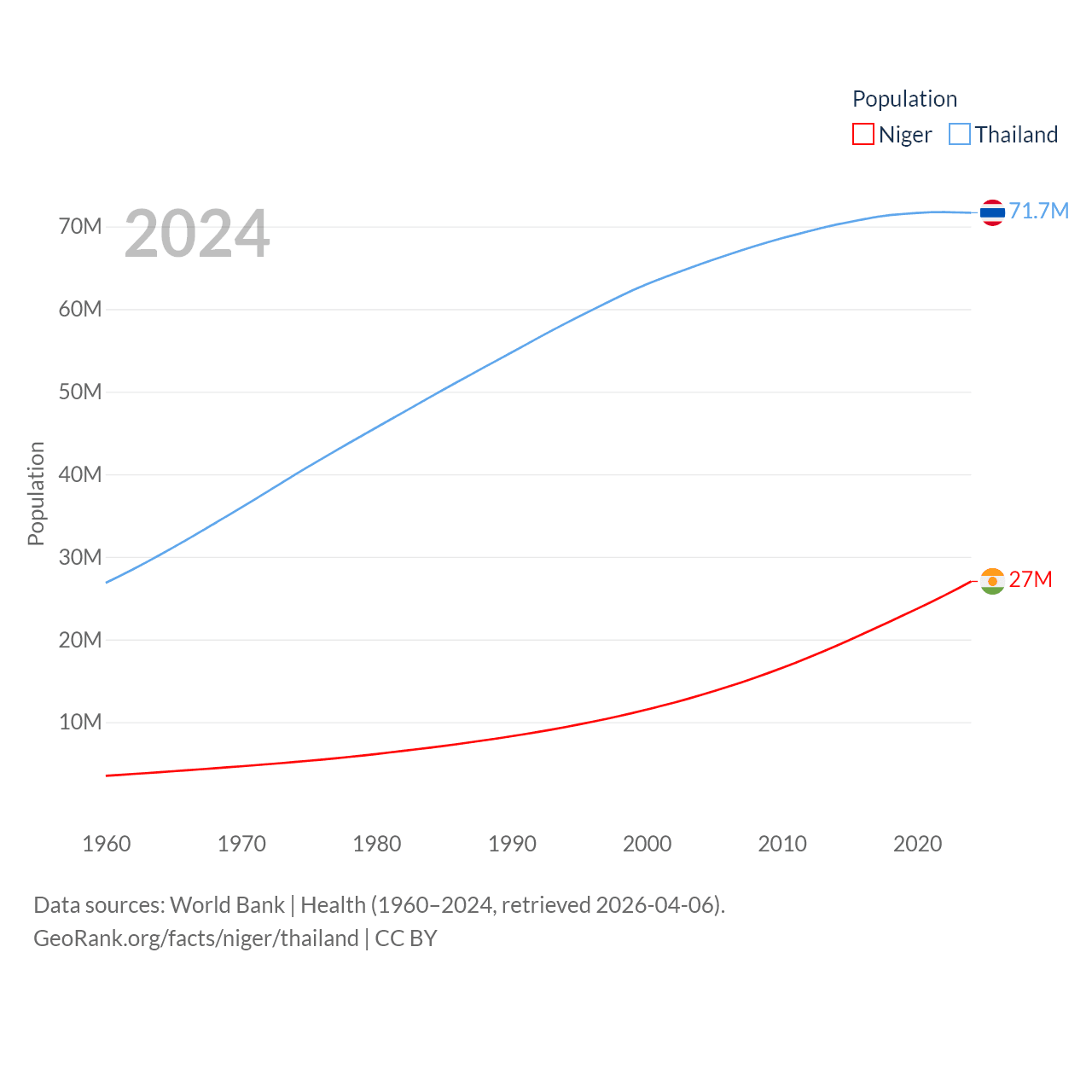 Niger has a population of 27M (ranked 55/197), compared with 71.7M in Thailand (ranked 20/197). Niger's land area is 489,076 sq mi versus 197,256 sq mi for Thailand (ranked 20th vs. 50th).