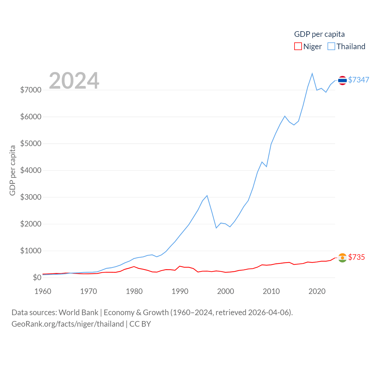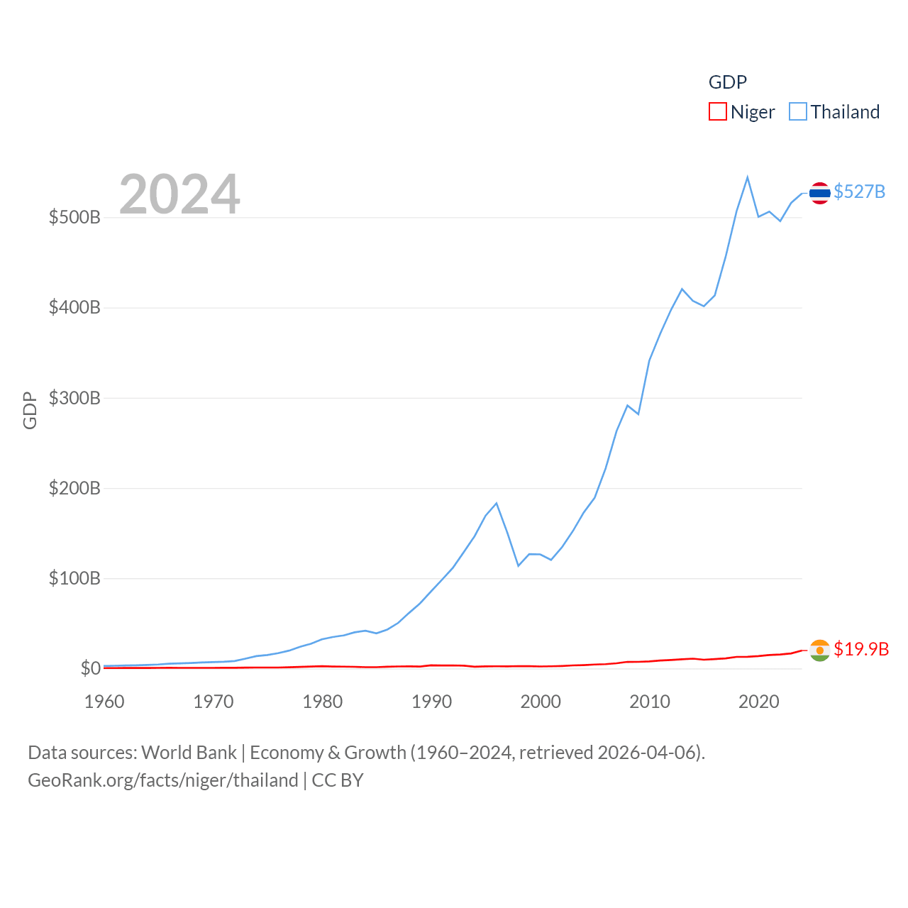 By GDP, Niger ranks 130/197 ($19.9B) and Thailand ranks 31/197 ($527B). By GDP per capita, Niger ranks 187/197 ($735), while Thailand ranks 100/197 ($7,347).