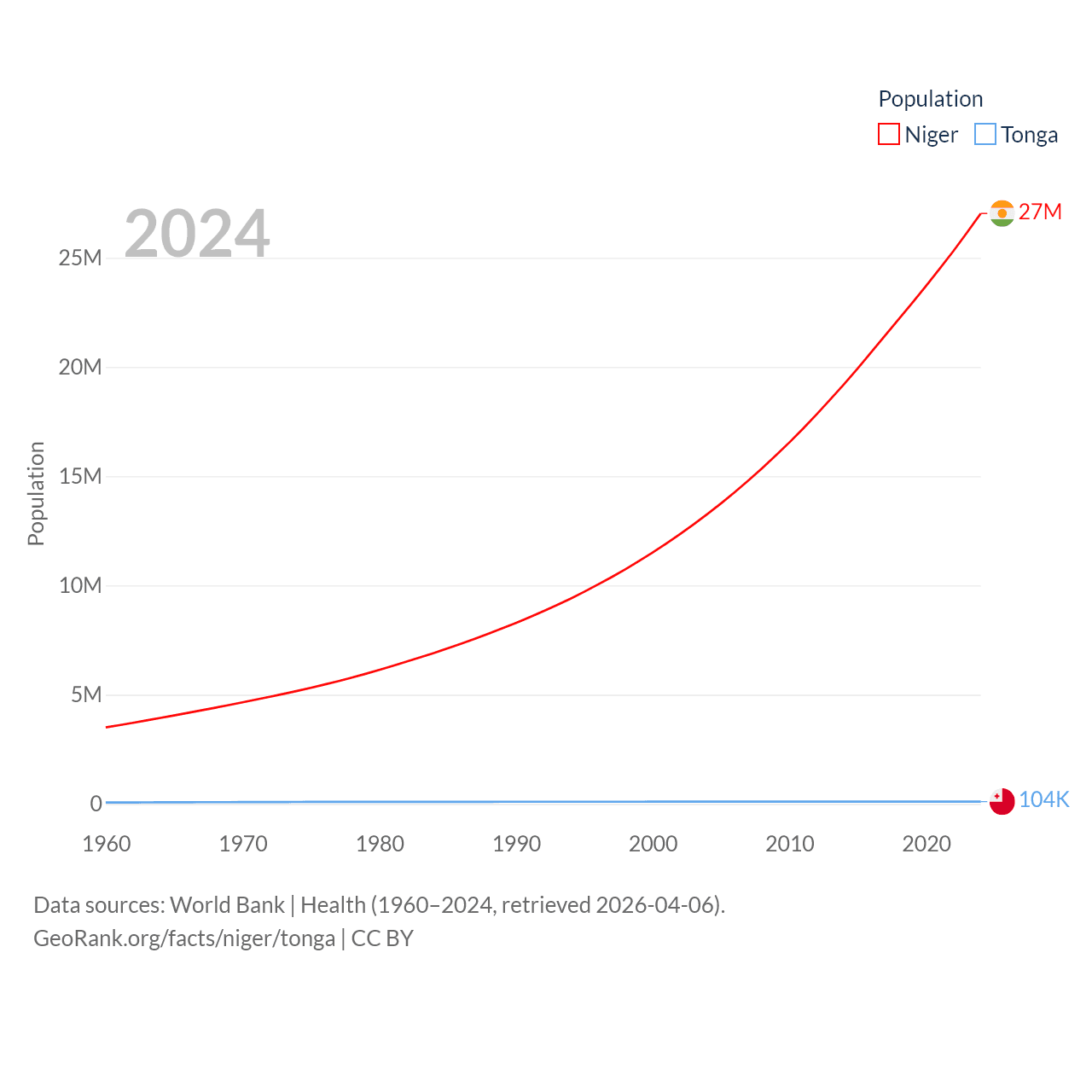 Niger has a population of 27M (ranked 55/197), compared with 104K in Tonga (ranked 183/197). Niger's land area is 489,076 sq mi versus 278 sq mi for Tonga (ranked 20th vs. 176th).