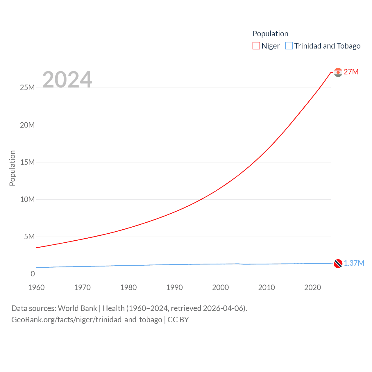 Niger has a population of 27M (ranked 55/197), compared with 1.37M in Trinidad and Tobago (ranked 154/197). Niger's land area is 489,076 sq mi versus 1,981 sq mi for Trinidad and Tobago (ranked 20th vs. 166th).