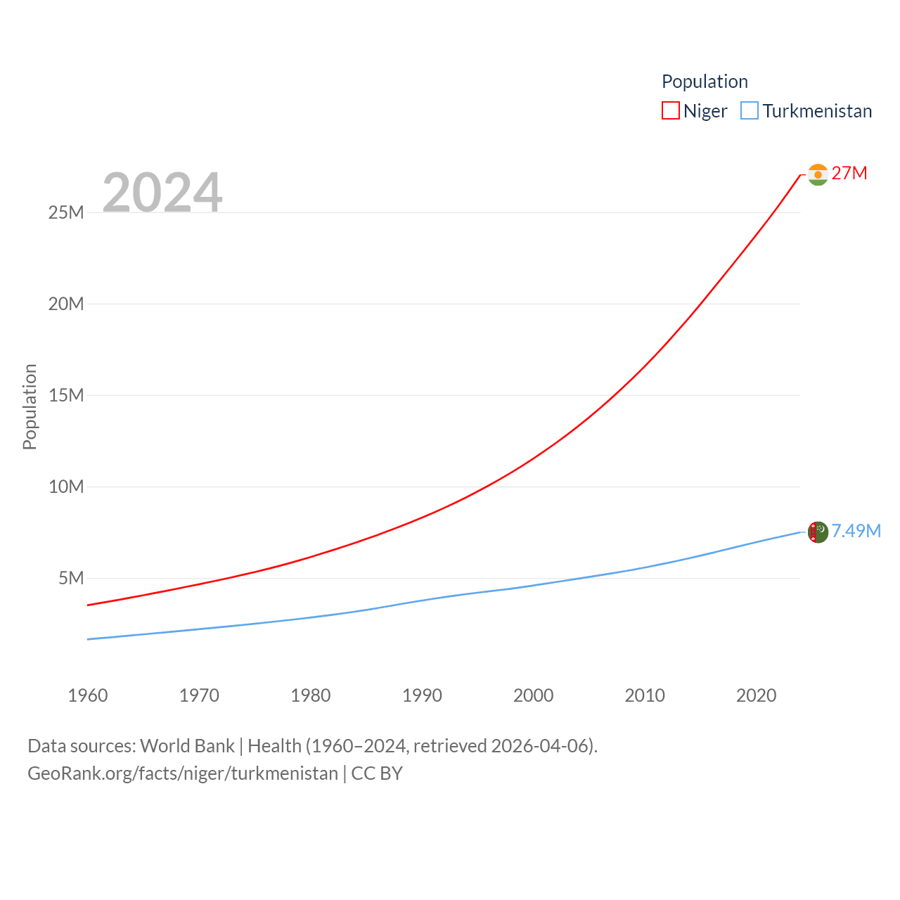 Niger has a population of 27M (ranked 55/197), compared with 7.49M in Turkmenistan (ranked 104/197). Niger's land area is 489,076 sq mi versus 181,441 sq mi for Turkmenistan (ranked 20th vs. 53rd).