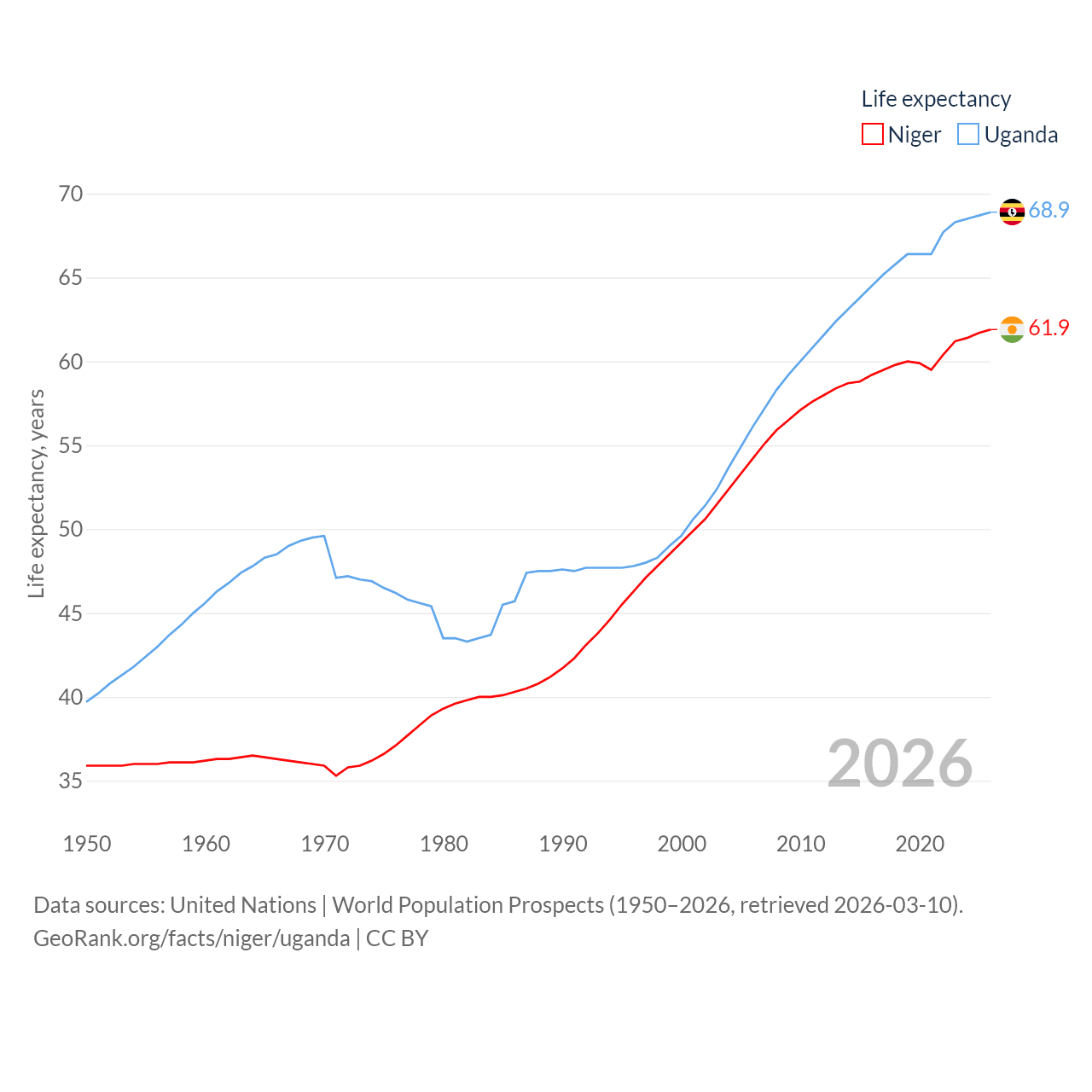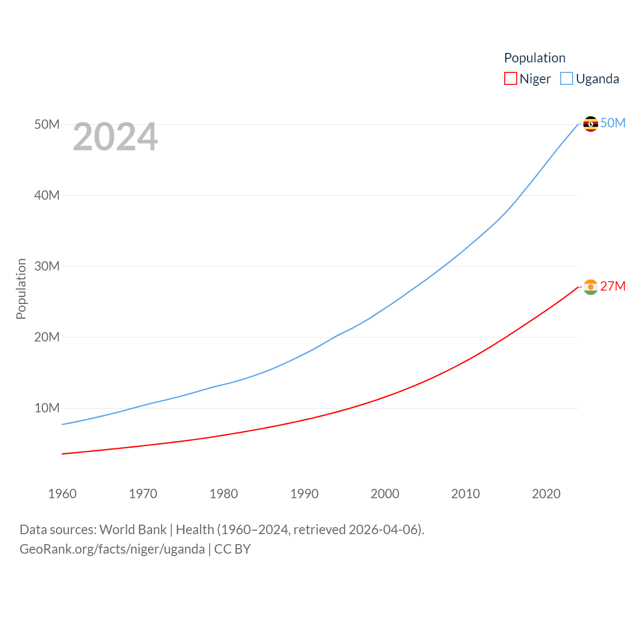 Niger has a population of 27M (ranked 55/197), compared with 50M in Uganda (ranked 31/197). Niger's land area is 489,076 sq mi versus 77,421 sq mi for Uganda (ranked 20th vs. 84th).