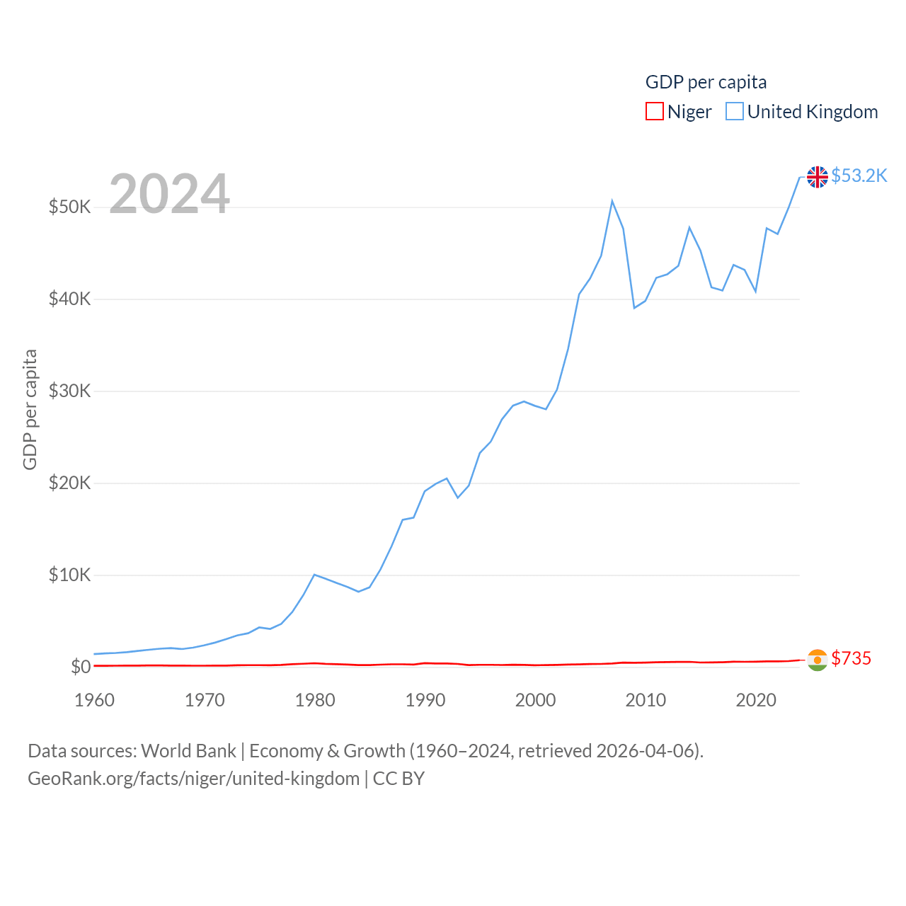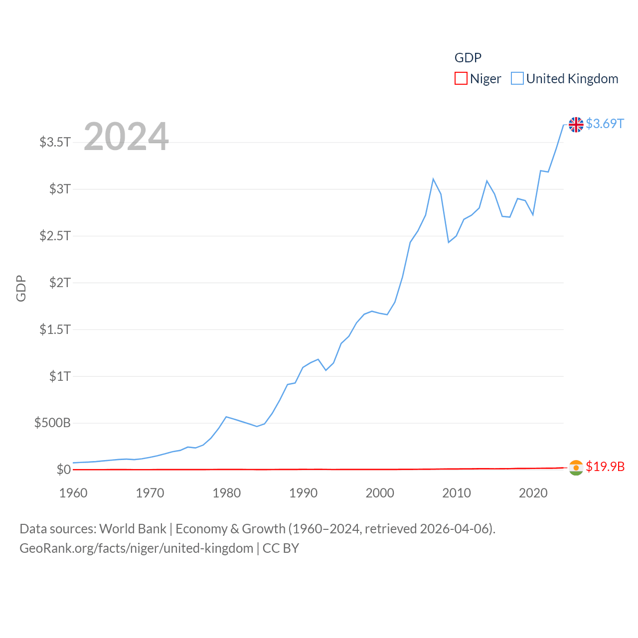 By GDP, Niger ranks 130/197 ($19.9B) and The United Kingdom ranks 6/197 ($3.69T). By GDP per capita, Niger ranks 187/197 ($735), while The United Kingdom ranks 22/197 ($53,246).