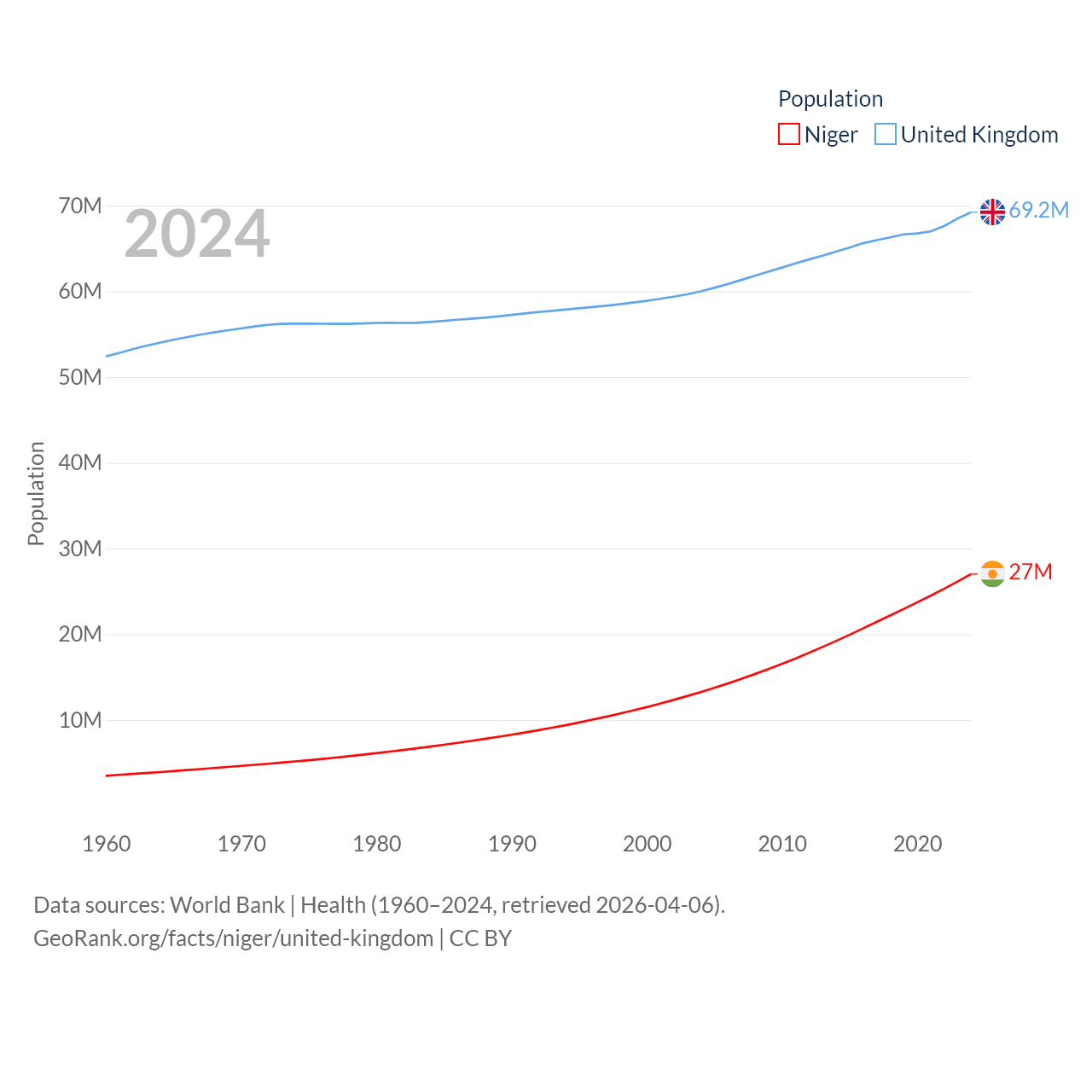 Niger has a population of 27M (ranked 55/197), compared with 69.2M in The United Kingdom (ranked 21/197). Niger's land area is 489,076 sq mi versus 93,410 sq mi for The United Kingdom (ranked 20th vs. 78th).