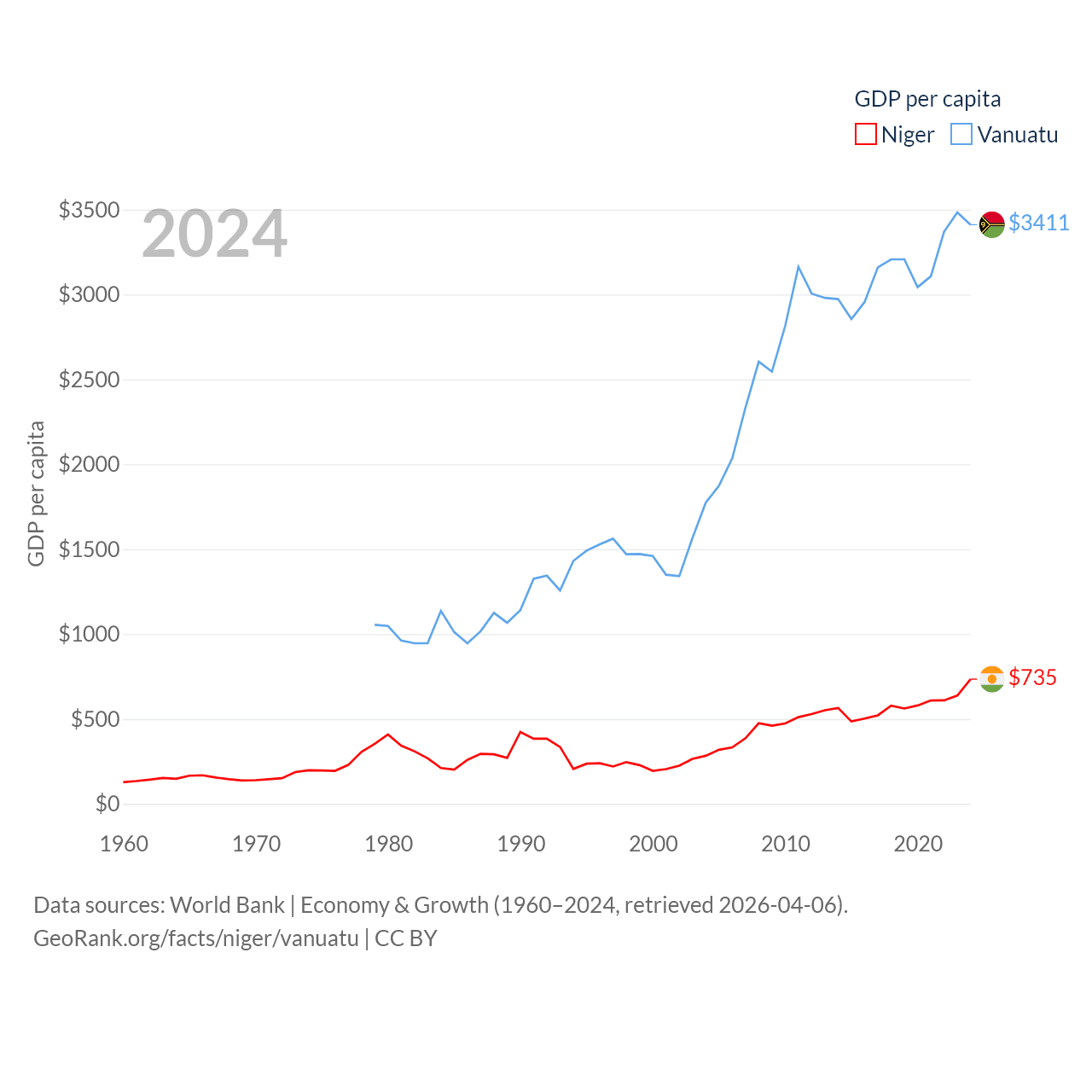 By GDP, Niger ranks 130/197 ($19.9B) and Vanuatu ranks 188/197 ($1.12B). By GDP per capita, Niger ranks 187/197 ($735), while Vanuatu ranks 137/197 ($3,411).