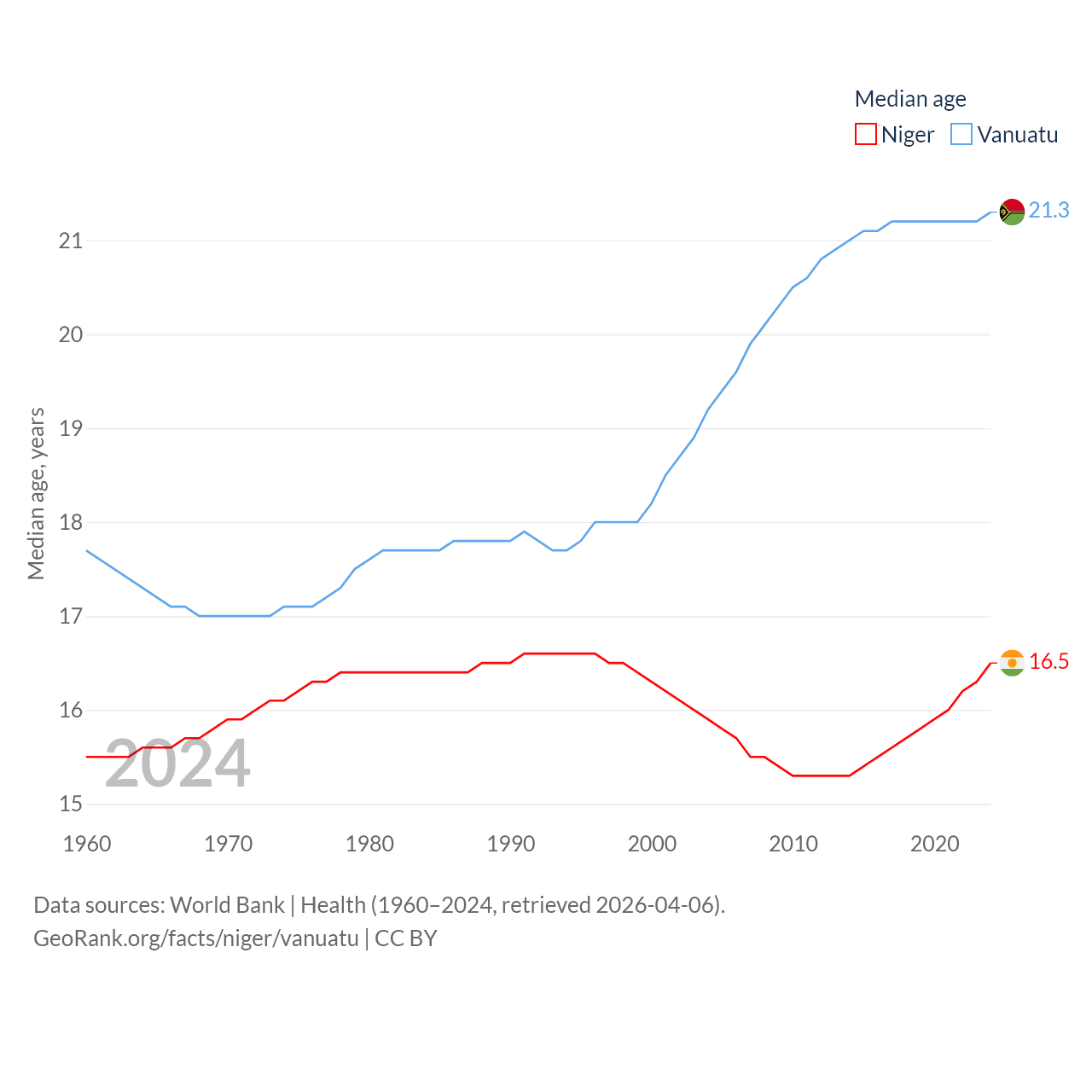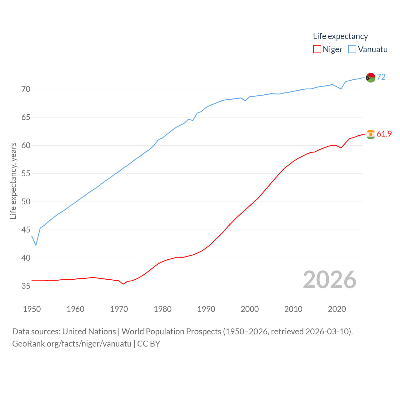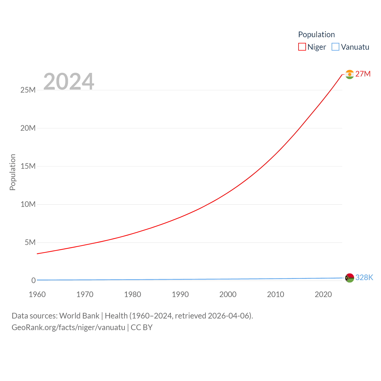 Niger has a population of 27M (ranked 55/197), compared with 328K in Vanuatu (ranked 174/197). Niger's land area is 489,076 sq mi versus 4,707 sq mi for Vanuatu (ranked 20th vs. 157th).