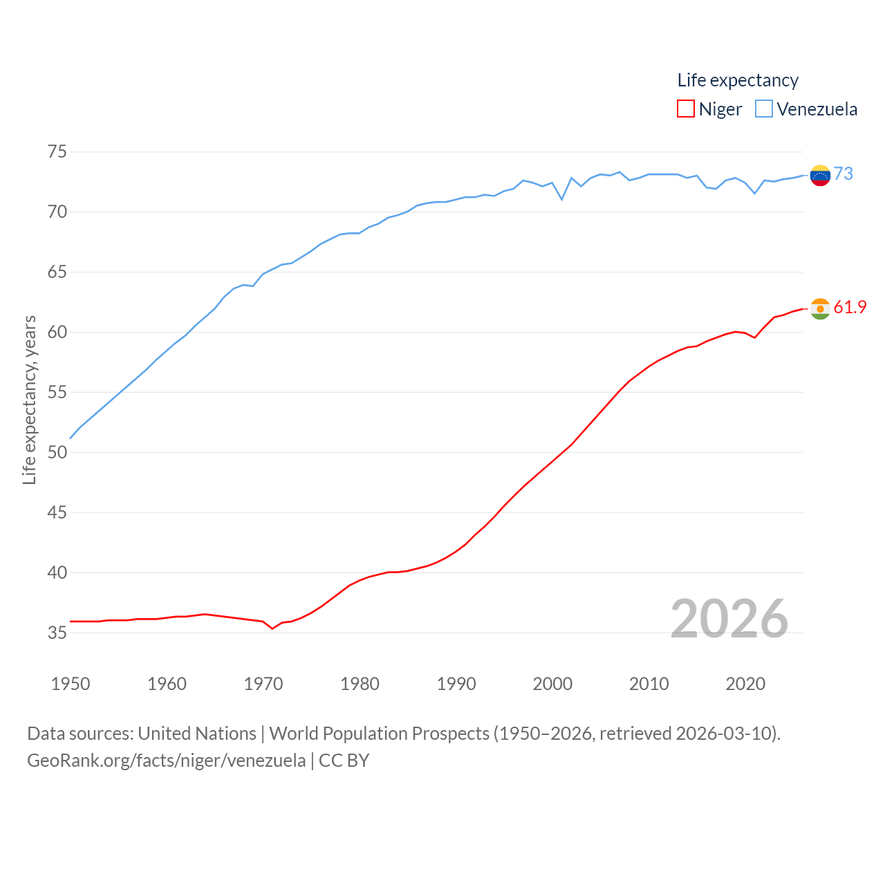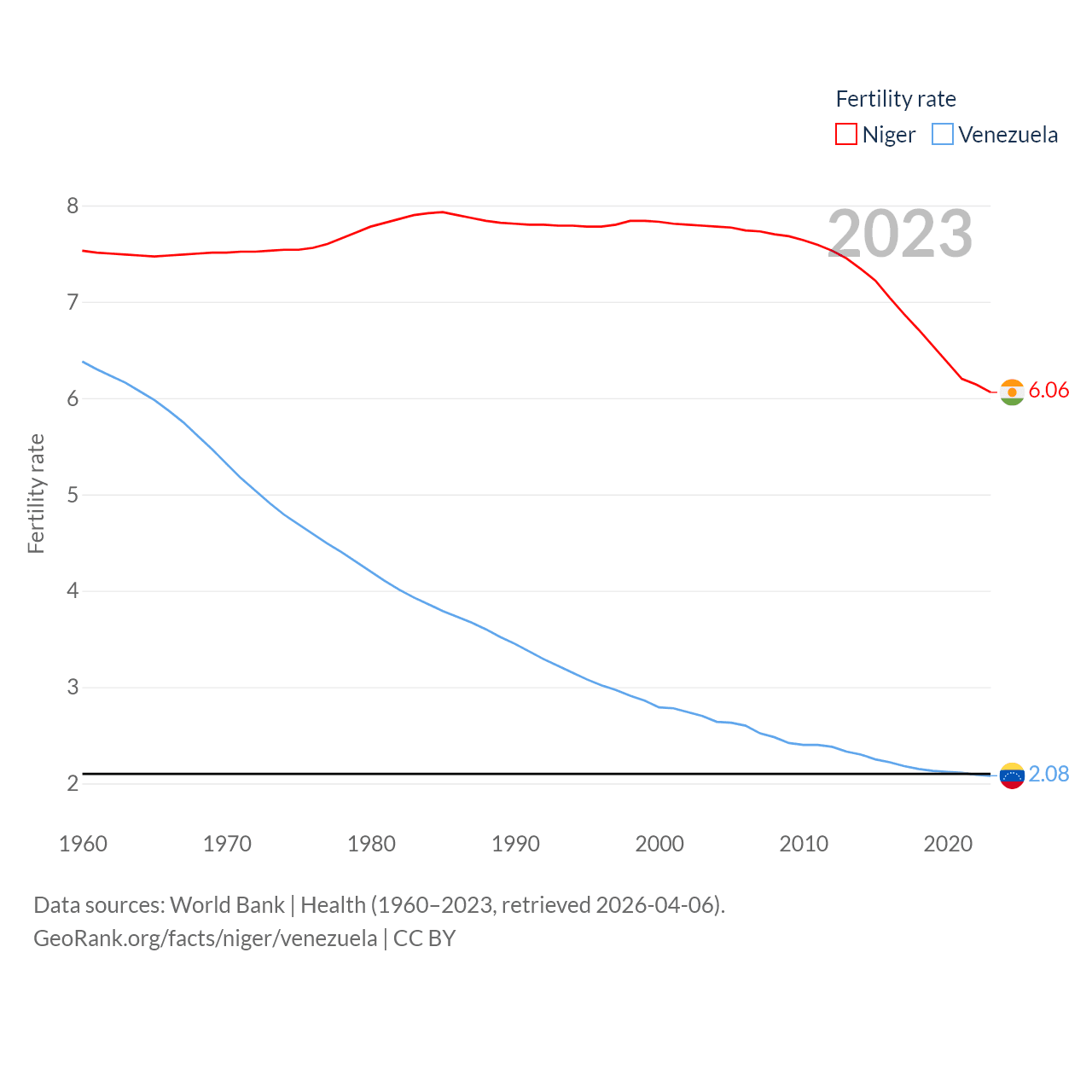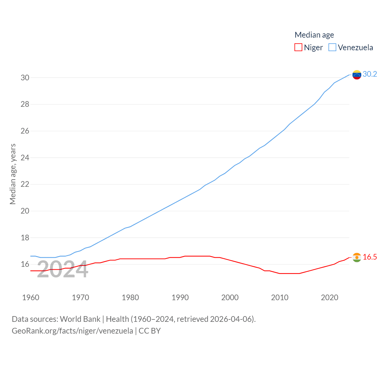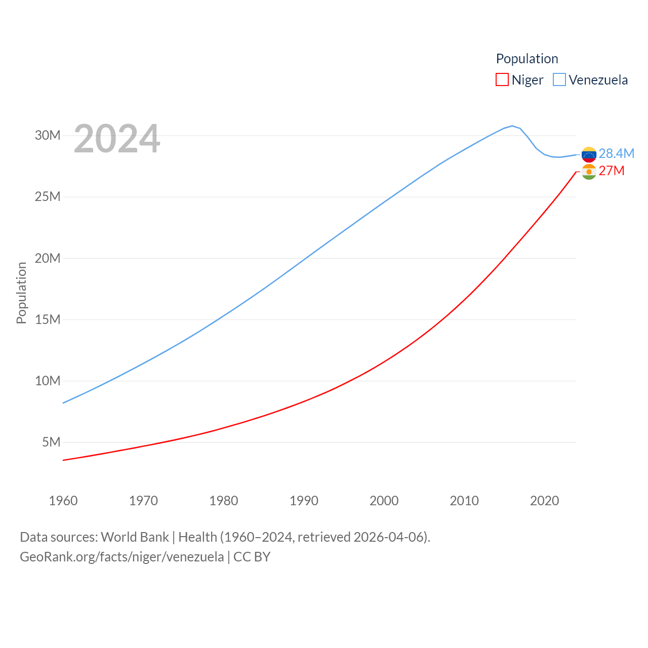 Niger has a population of 27M (ranked 55/197), compared with 28.4M in Venezuela (ranked 53/197). Niger's land area is 489,076 sq mi versus 340,561 sq mi for Venezuela (ranked 20th vs. 32nd).