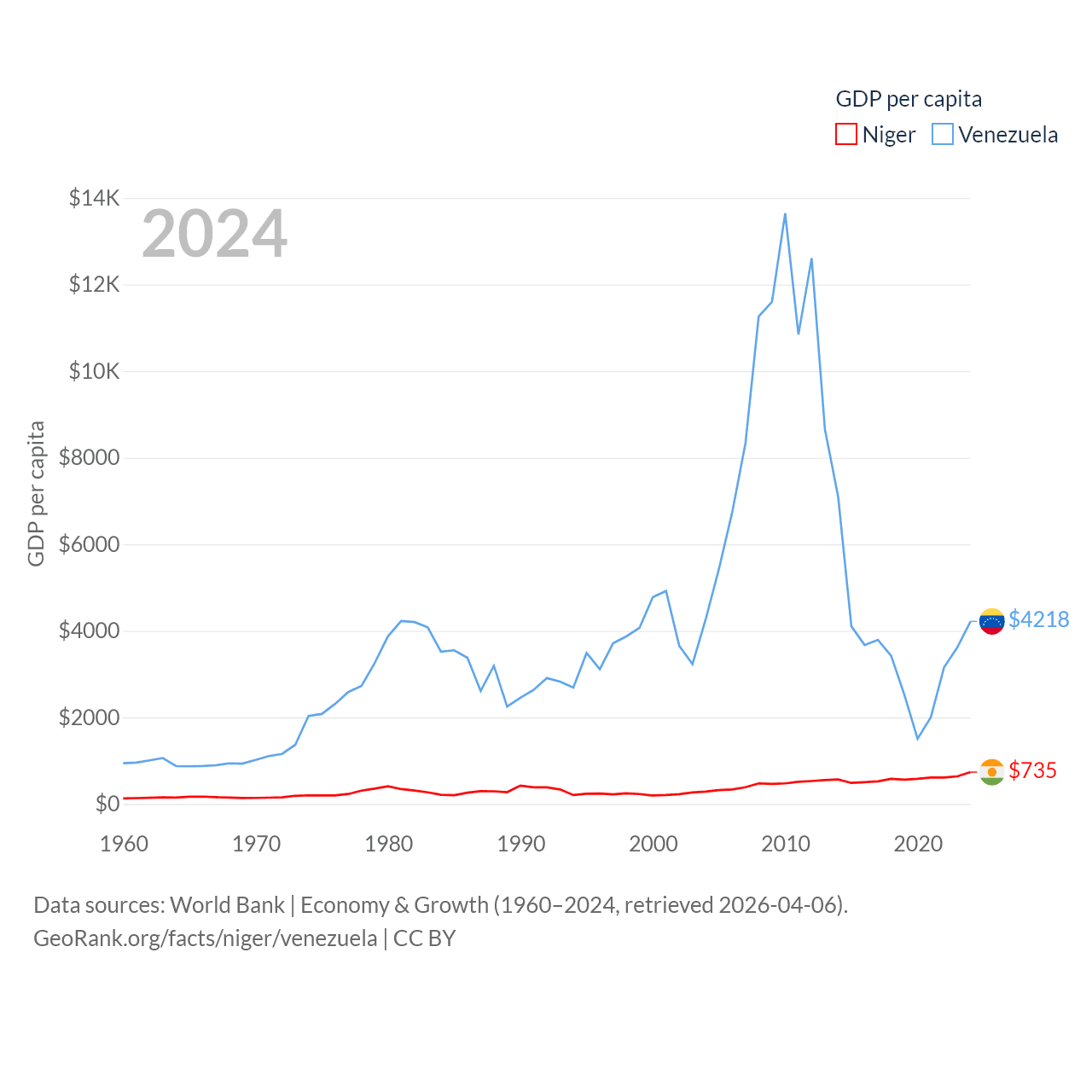 By GDP, Niger ranks 130/197 ($19.9B) and Venezuela ranks 65/197 ($120B). By GDP per capita, Niger ranks 187/197 ($735), while Venezuela ranks 128/197 ($4,218).