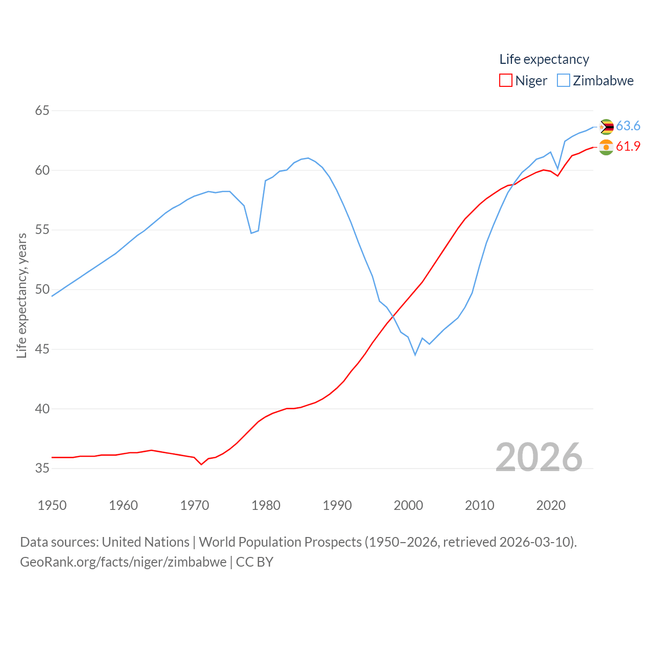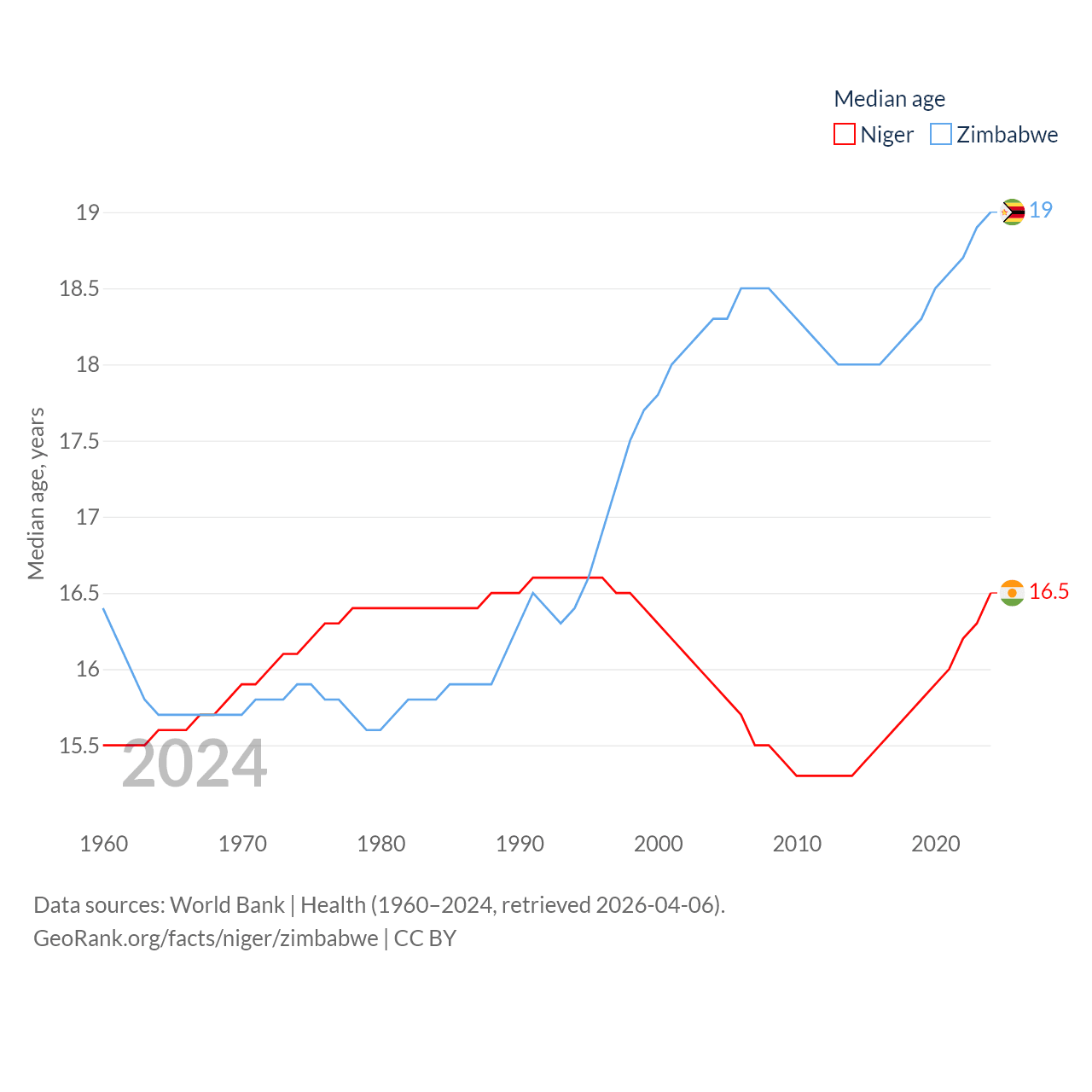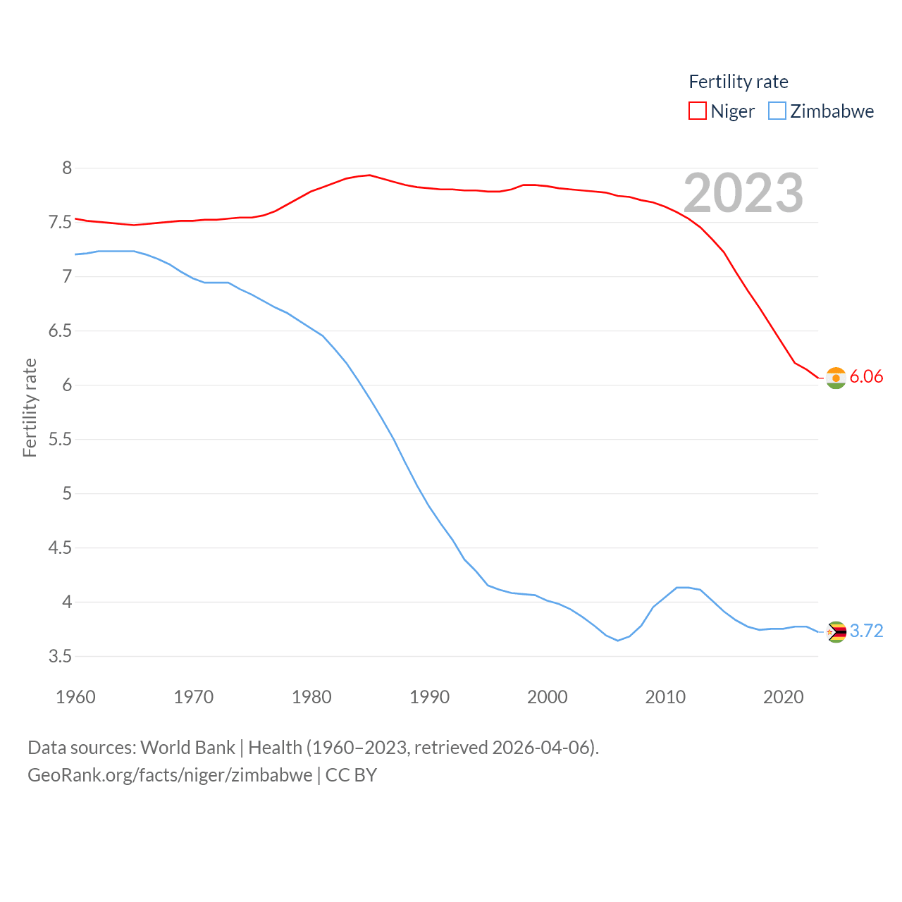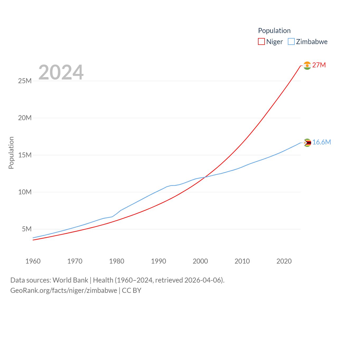 Niger has a population of 27M (ranked 55/197), compared with 16.6M in Zimbabwe (ranked 74/197). Niger's land area is 489,076 sq mi versus 149,364 sq mi for Zimbabwe (ranked 20th vs. 60th).