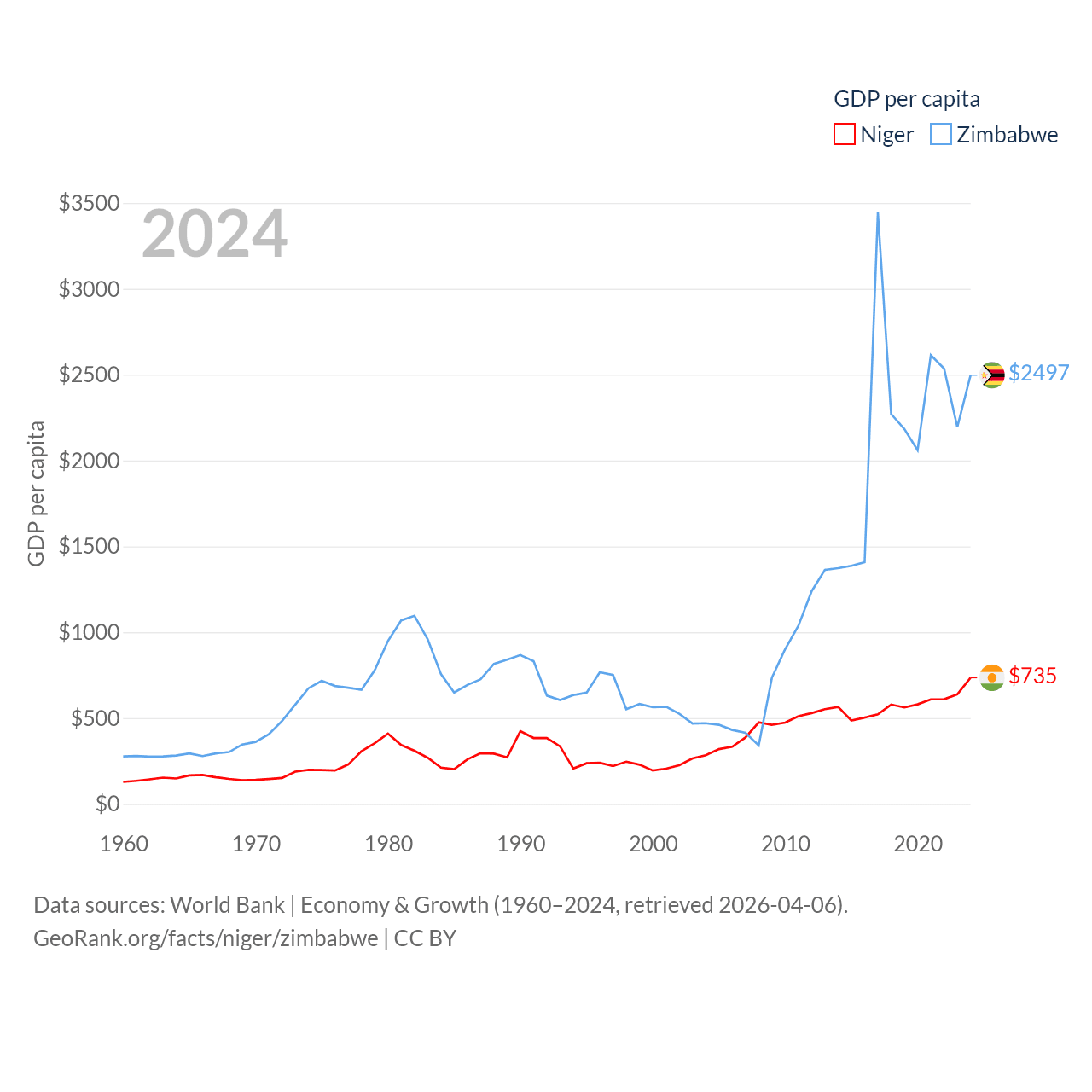 By GDP, Niger ranks 130/197 ($19.9B) and Zimbabwe ranks 102/197 ($41.5B). By GDP per capita, Niger ranks 187/197 ($735), while Zimbabwe ranks 148/197 ($2,497).