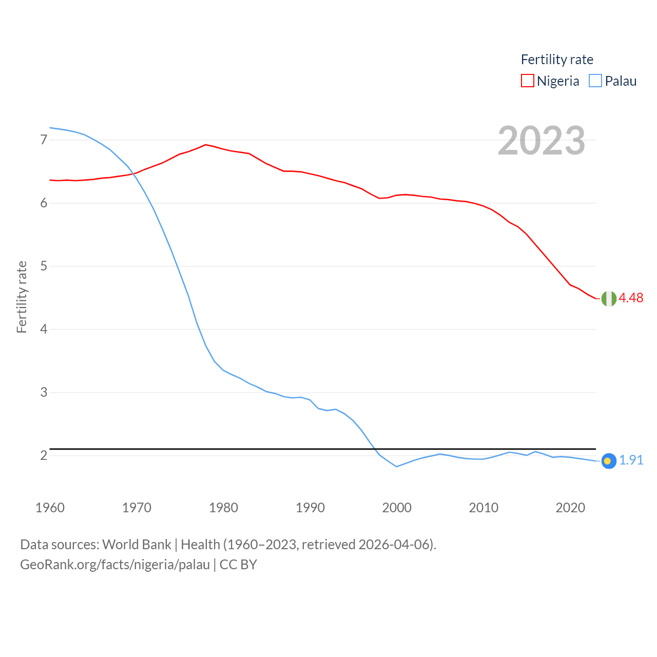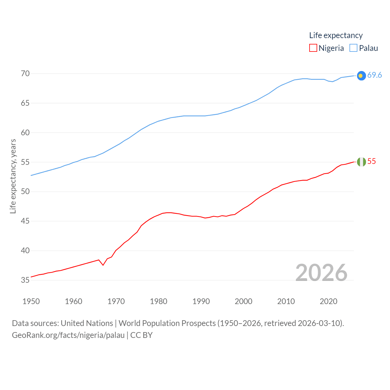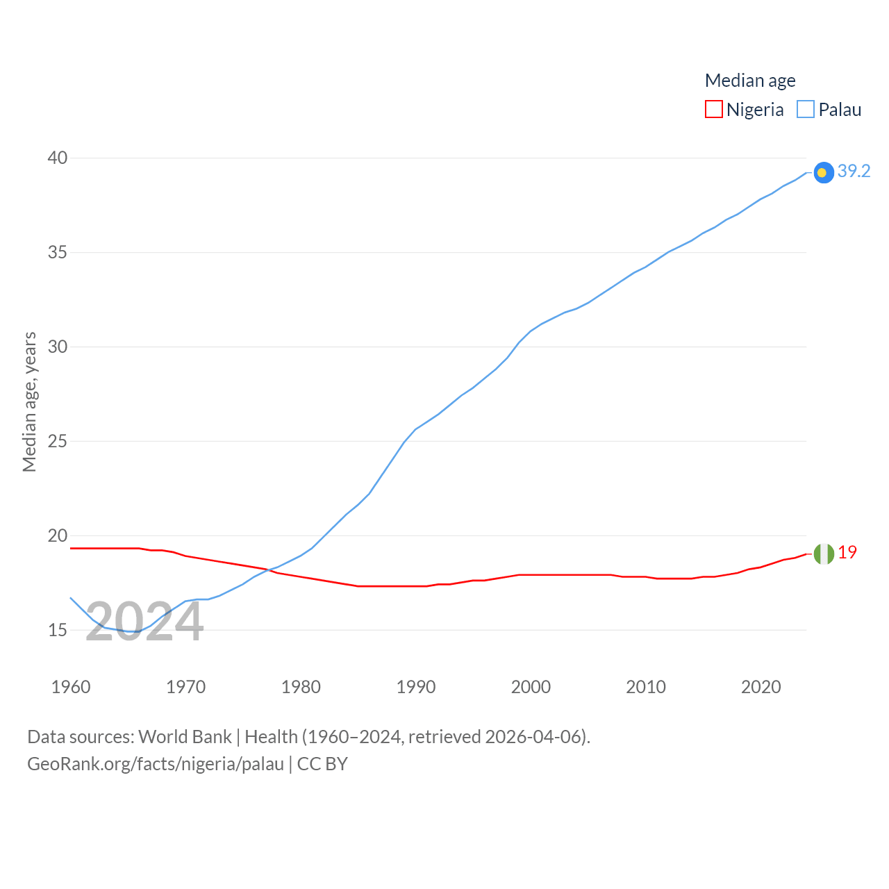 Nigeria has a population of 233M (ranked 6/197), compared with 17.7K in Palau (ranked 194/197). Nigeria's land area is 351,650 sq mi versus 177.6 sq mi for Palau (ranked 30th vs. 180th).
