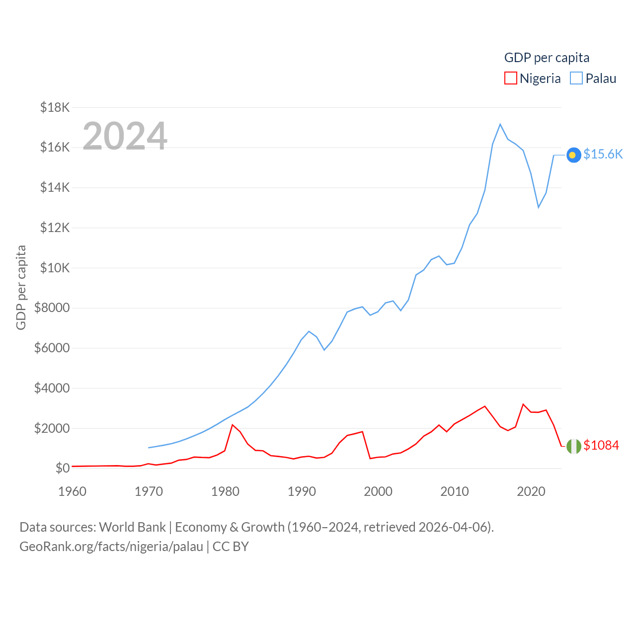 By GDP, Nigeria ranks 54/197 ($252B) and Palau ranks 194/197 ($277M). By GDP per capita, Nigeria ranks 174/197 ($1,084), while Palau ranks 67/197 ($15,611).