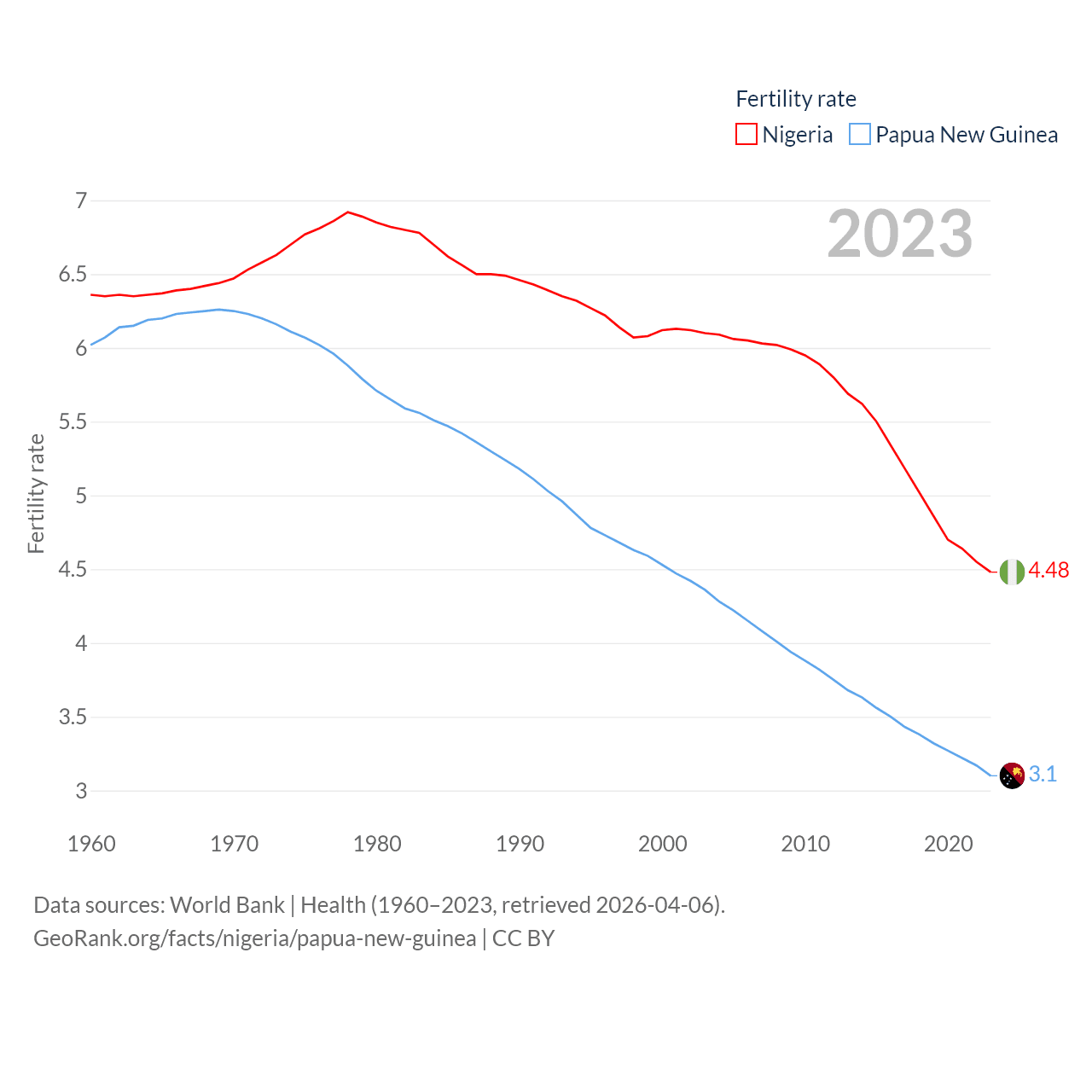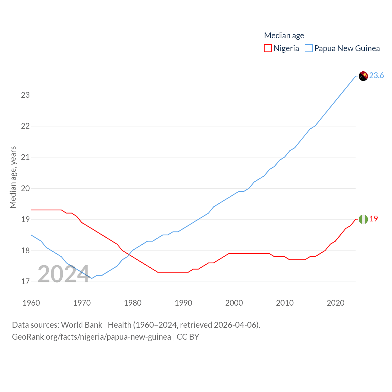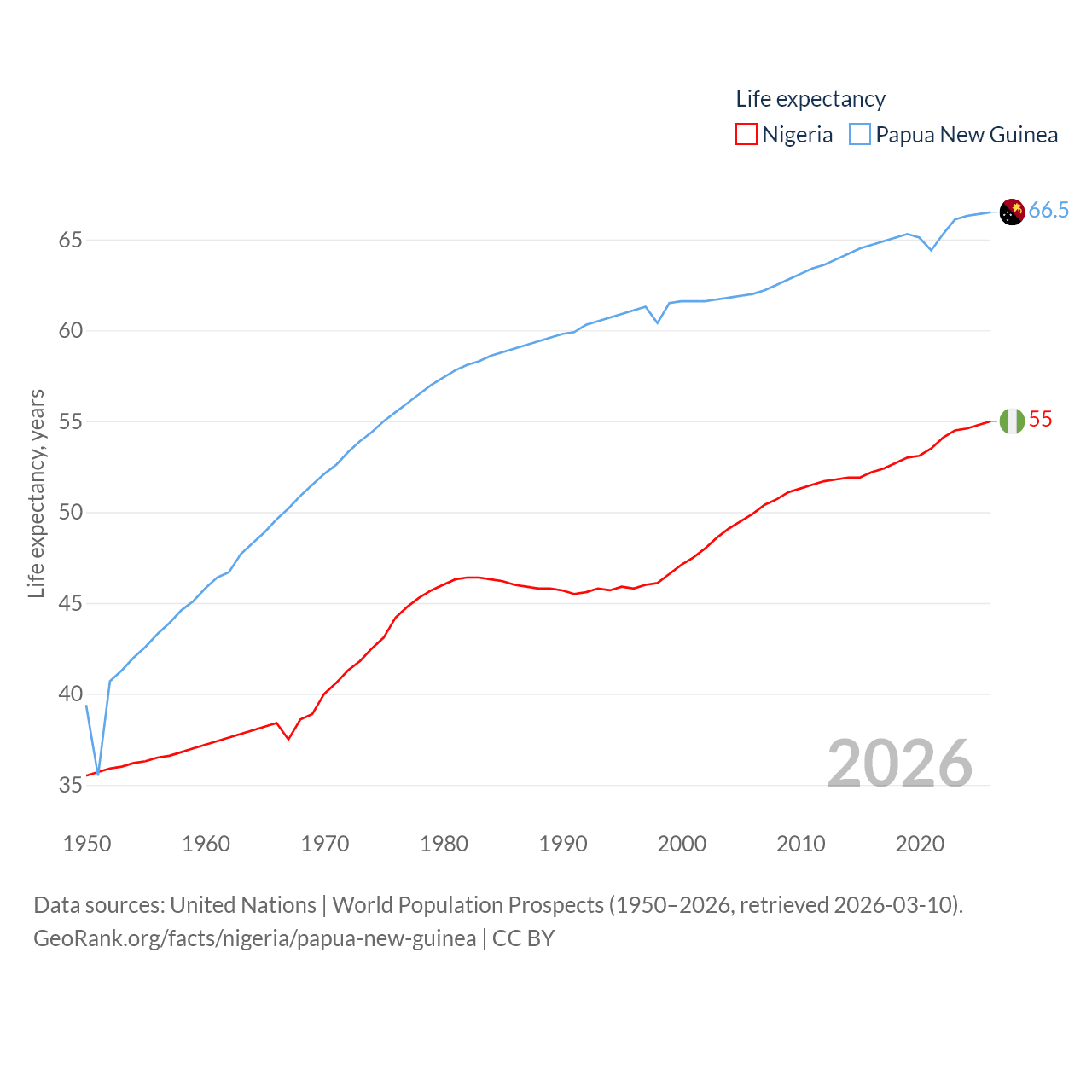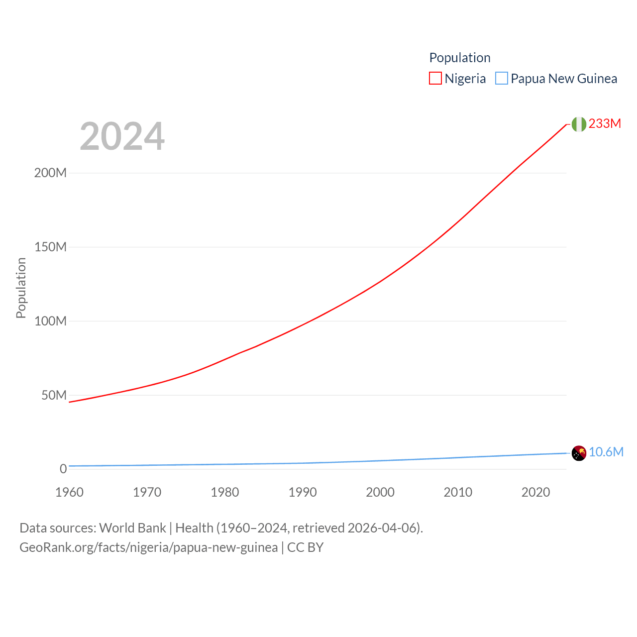 Nigeria has a population of 233M (ranked 6/197), compared with 10.6M in Papua New Guinea (ranked 92/197). Nigeria's land area is 351,650 sq mi versus 174,850 sq mi for Papua New Guinea (ranked 30th vs. 54th).