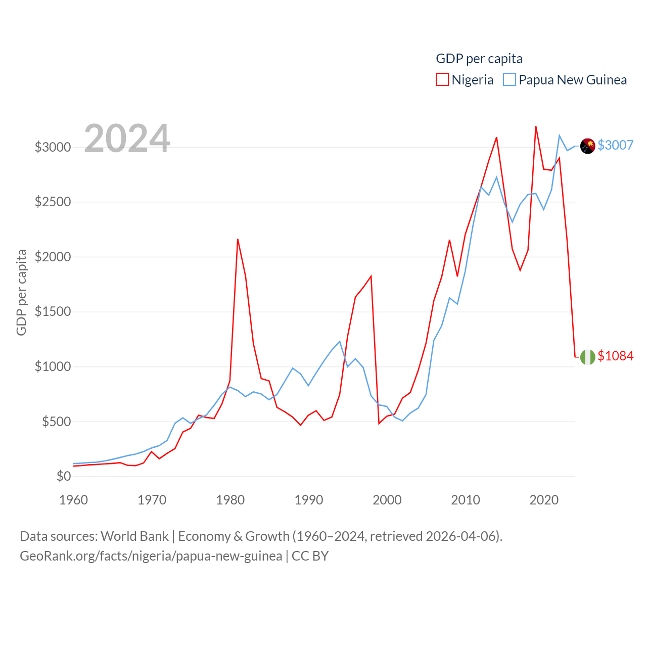 By GDP, Nigeria ranks 54/197 ($252B) and Papua New Guinea ranks 110/197 ($31.8B). By GDP per capita, Nigeria ranks 174/197 ($1,084), while Papua New Guinea ranks 140/197 ($3,007).