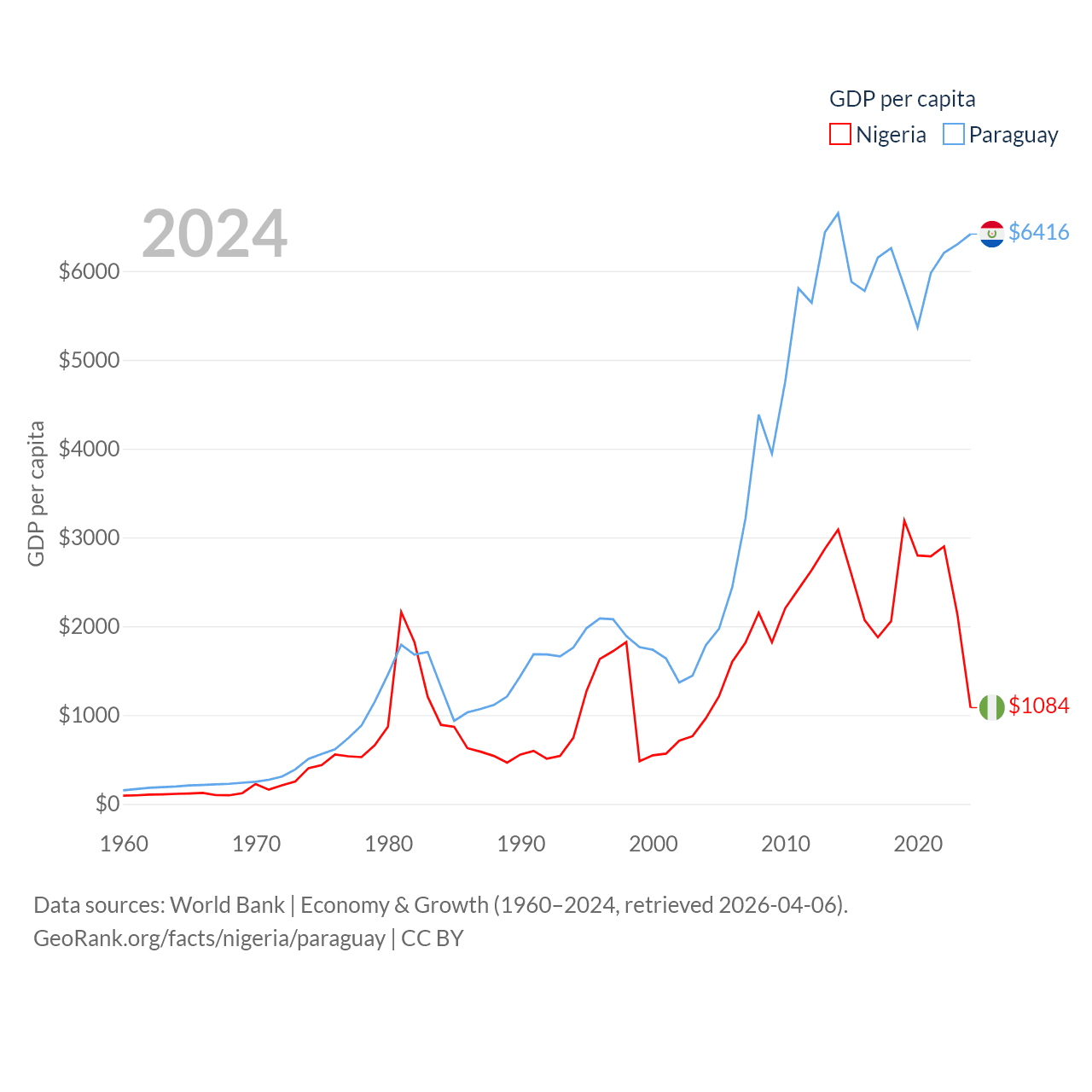 By GDP, Nigeria ranks 54/197 ($252B) and Paraguay ranks 98/197 ($44.5B). By GDP per capita, Nigeria ranks 174/197 ($1,084), while Paraguay ranks 109/197 ($6,416).