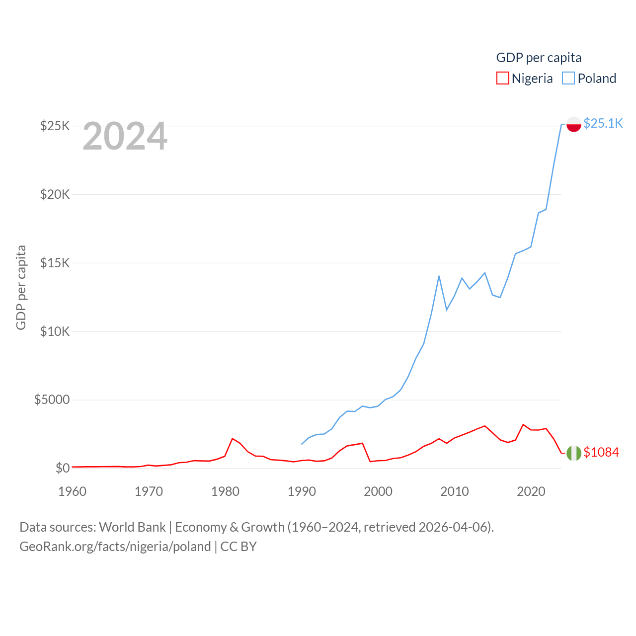 By GDP, Nigeria ranks 54/197 ($252B) and Poland ranks 21/197 ($918B). By GDP per capita, Nigeria ranks 174/197 ($1,084), while Poland ranks 48/197 ($25,104).