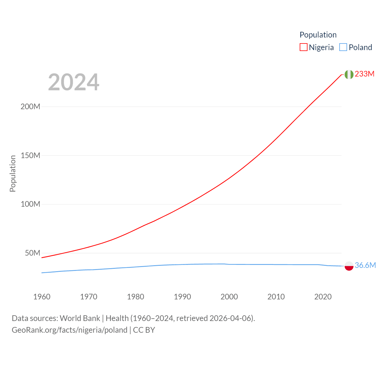Nigeria has a population of 233M (ranked 6/197), compared with 36.6M in Poland (ranked 42/197). Nigeria's land area is 351,650 sq mi versus 118,252 sq mi for Poland (ranked 30th vs. 69th).