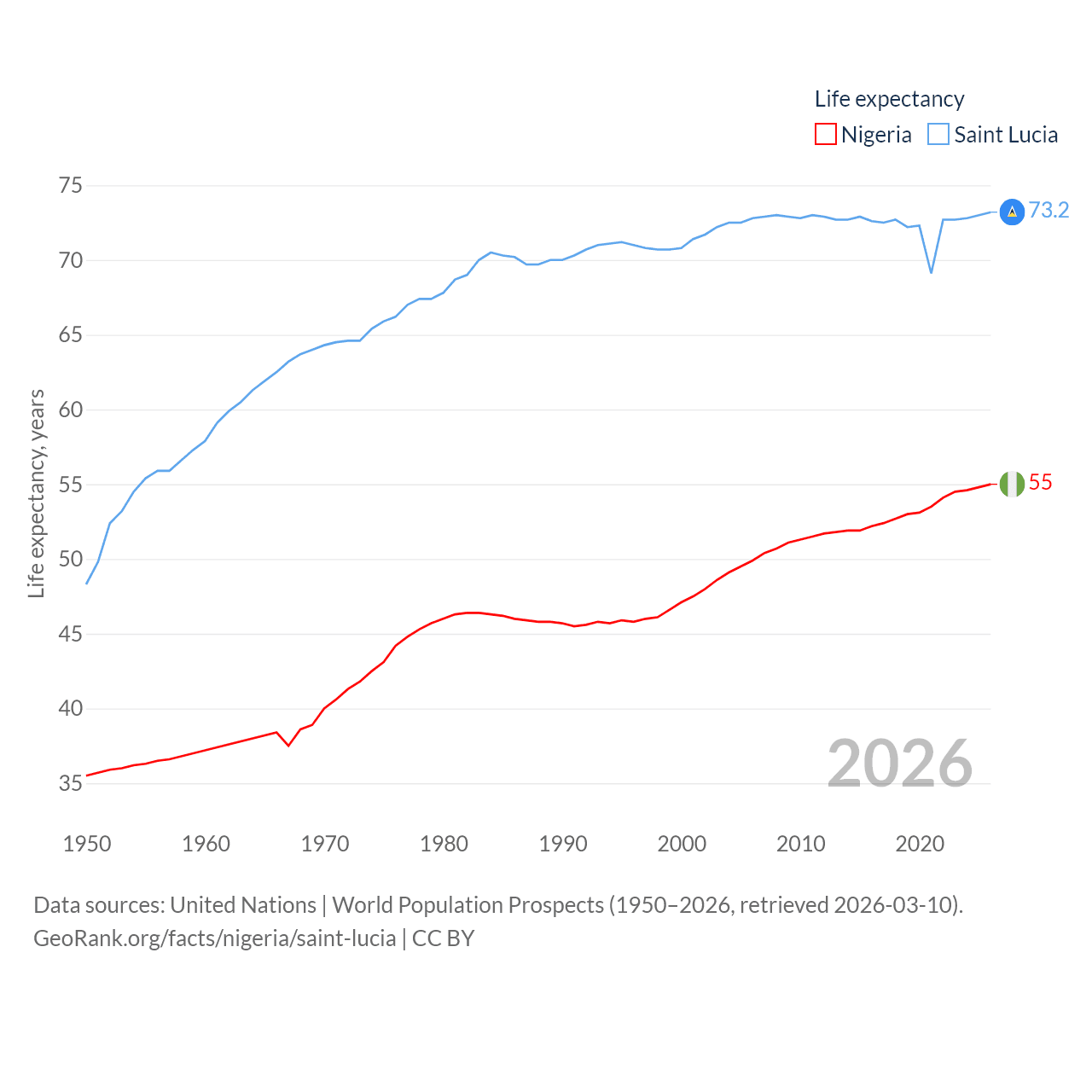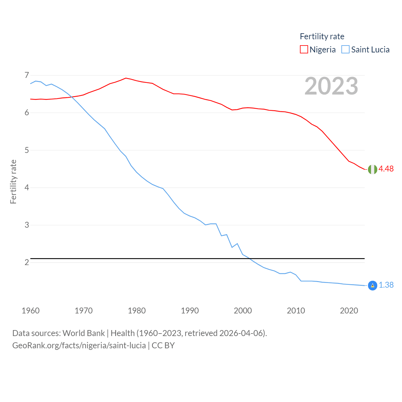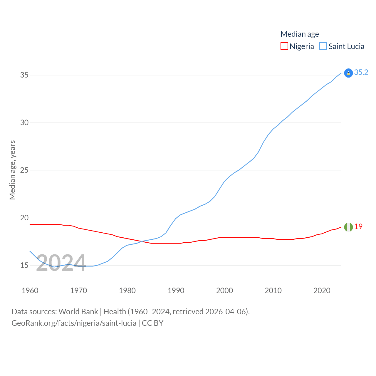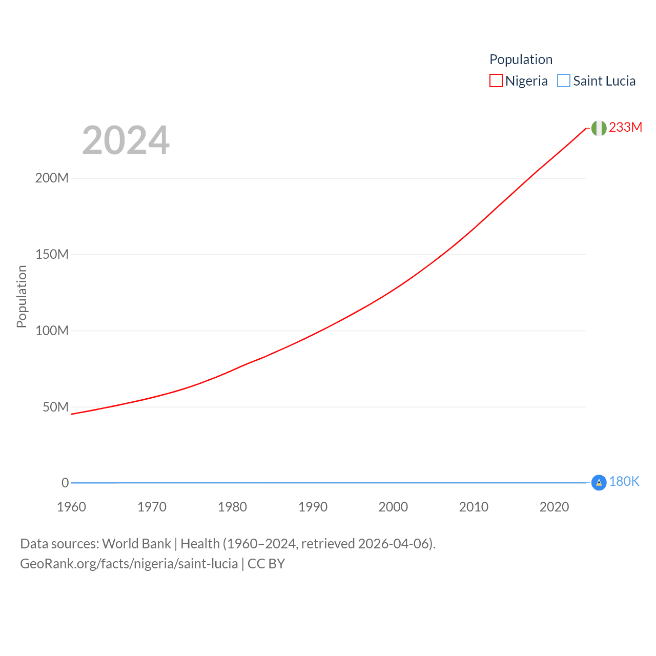 Nigeria has a population of 233M (ranked 6/197), compared with 180K in Saint Lucia (ranked 178/197). Nigeria's land area is 351,650 sq mi versus 235.5 sq mi for Saint Lucia (ranked 30th vs. 178th).
