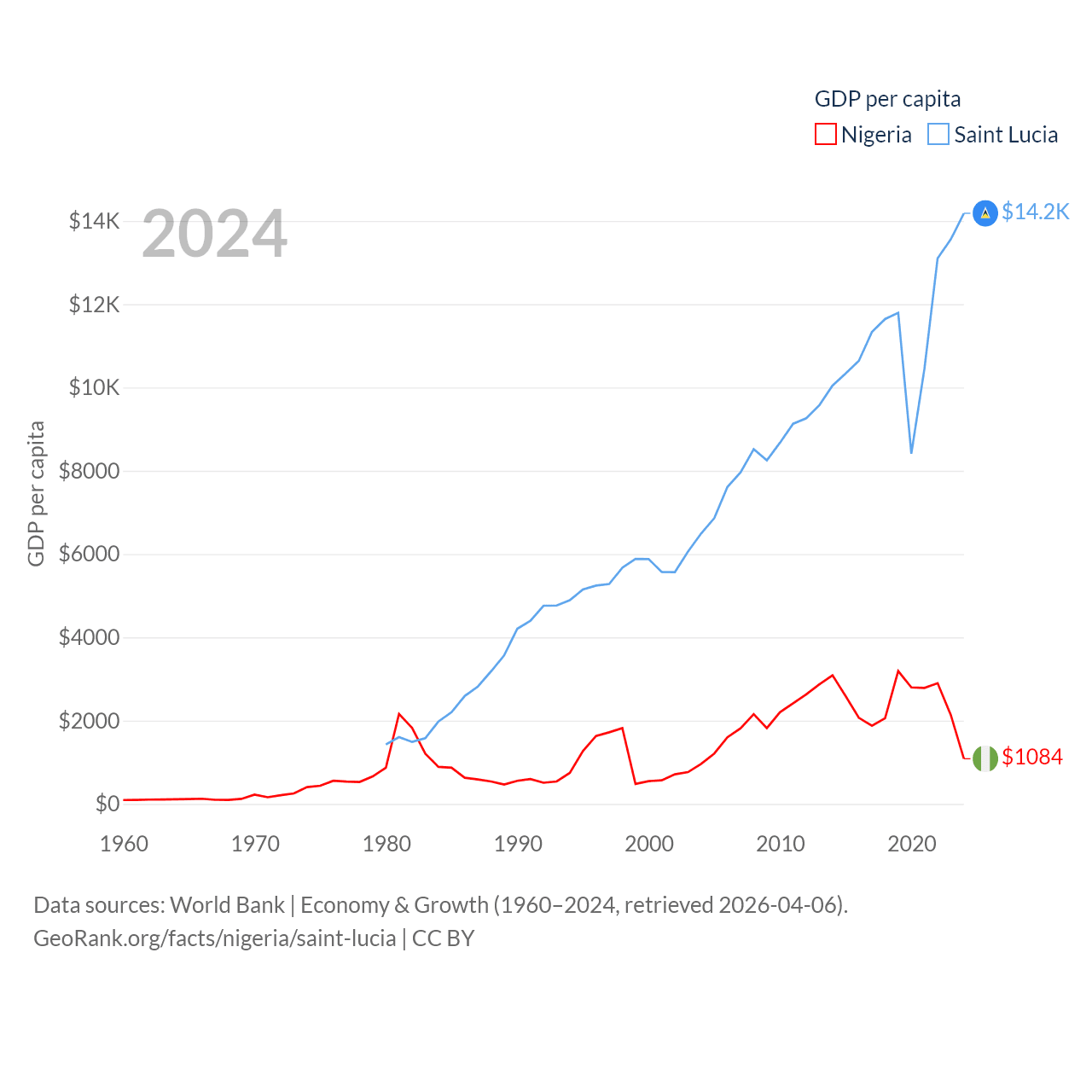 By GDP, Nigeria ranks 54/197 ($252B) and Saint Lucia ranks 173/197 ($2.55B). By GDP per capita, Nigeria ranks 174/197 ($1,084), while Saint Lucia ranks 70/197 ($14,182).
