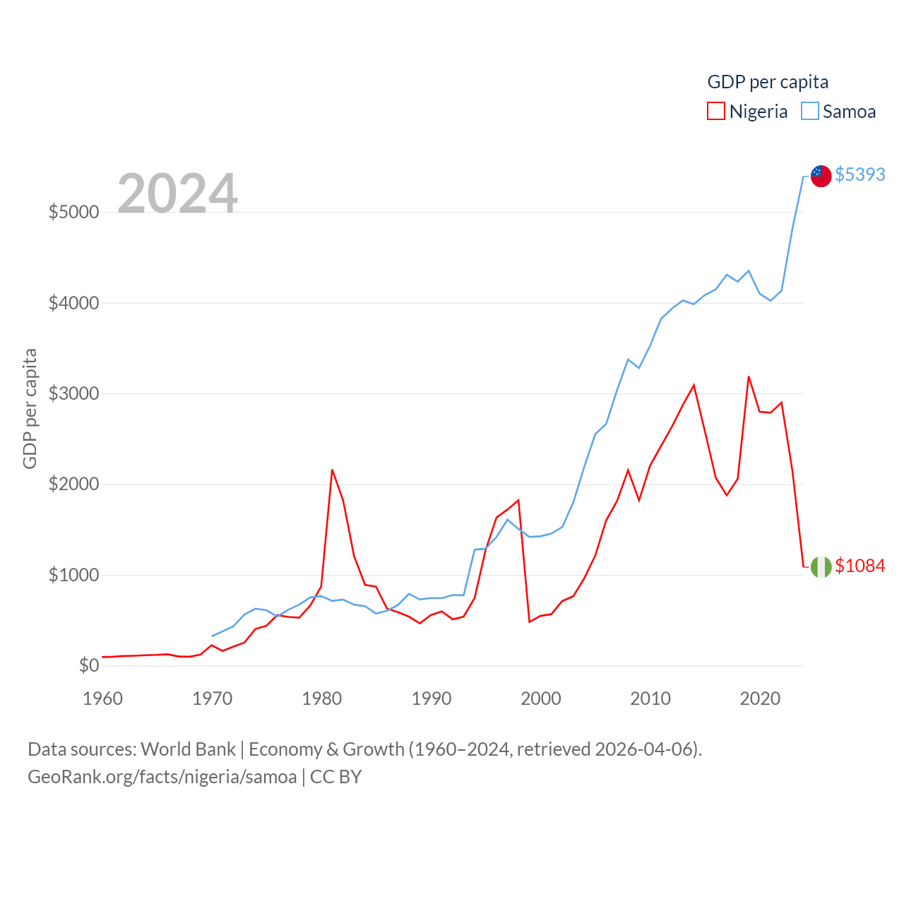 By GDP, Nigeria ranks 54/197 ($252B) and Samoa ranks 185/197 ($1.18B). By GDP per capita, Nigeria ranks 174/197 ($1,084), while Samoa ranks 117/197 ($5,393).
