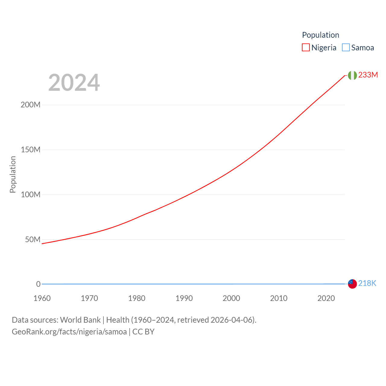 Nigeria has a population of 233M (ranked 6/197), compared with 218K in Samoa (ranked 177/197). Nigeria's land area is 351,650 sq mi versus 1,073 sq mi for Samoa (ranked 30th vs. 168th).