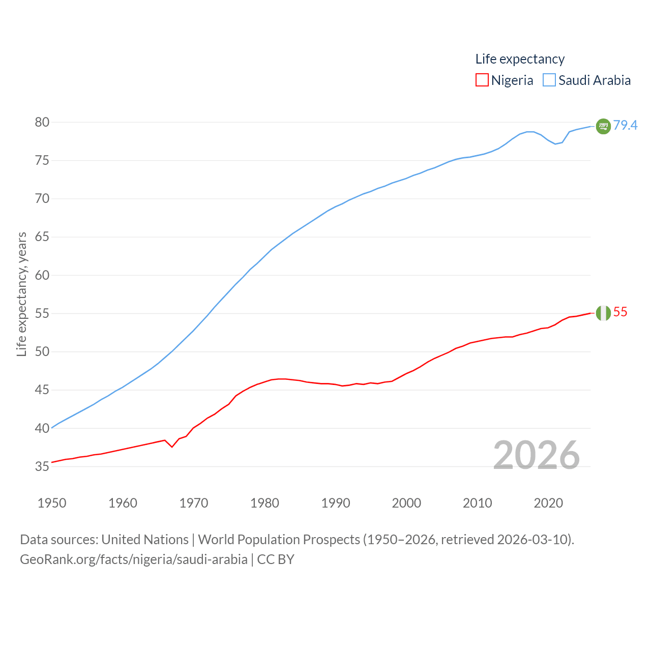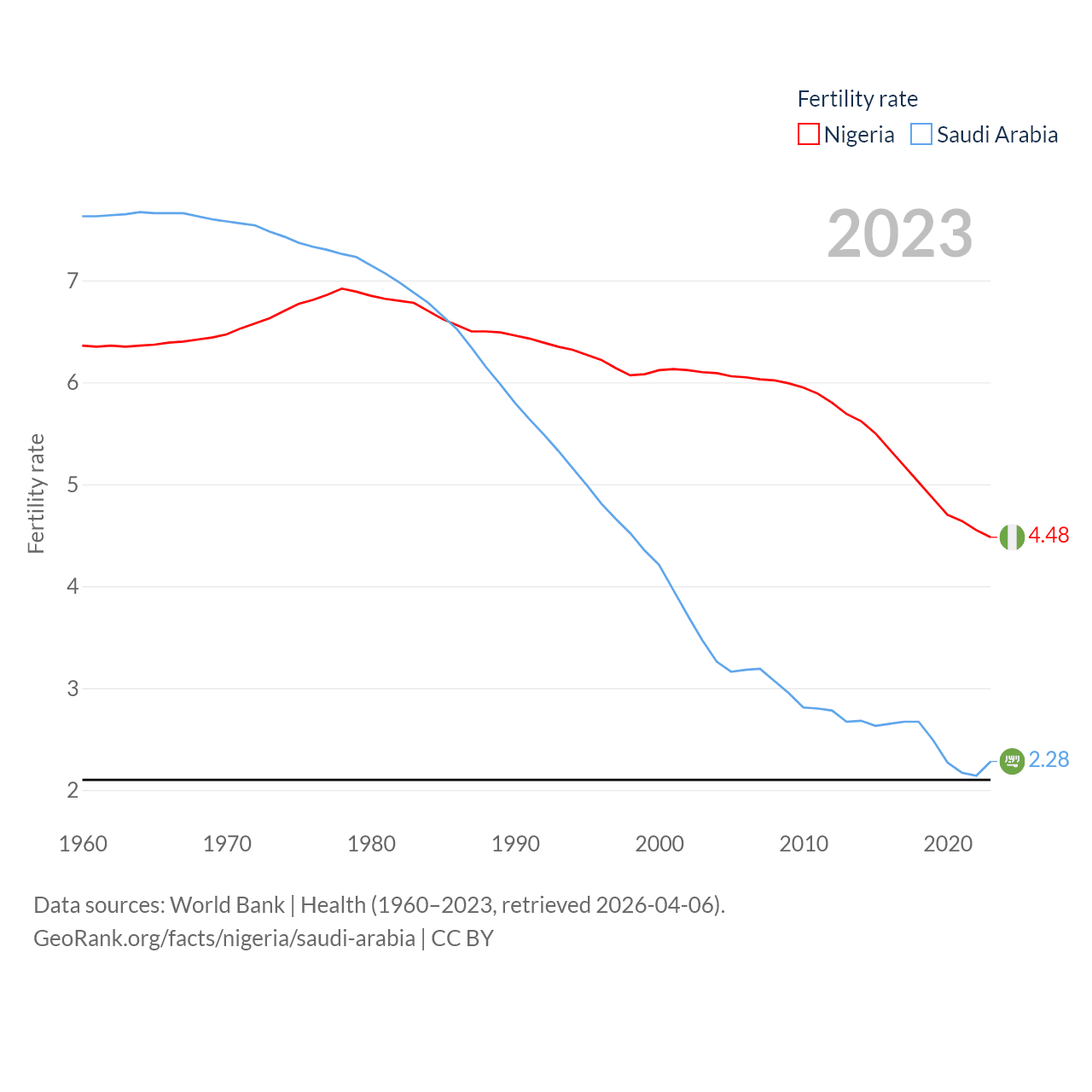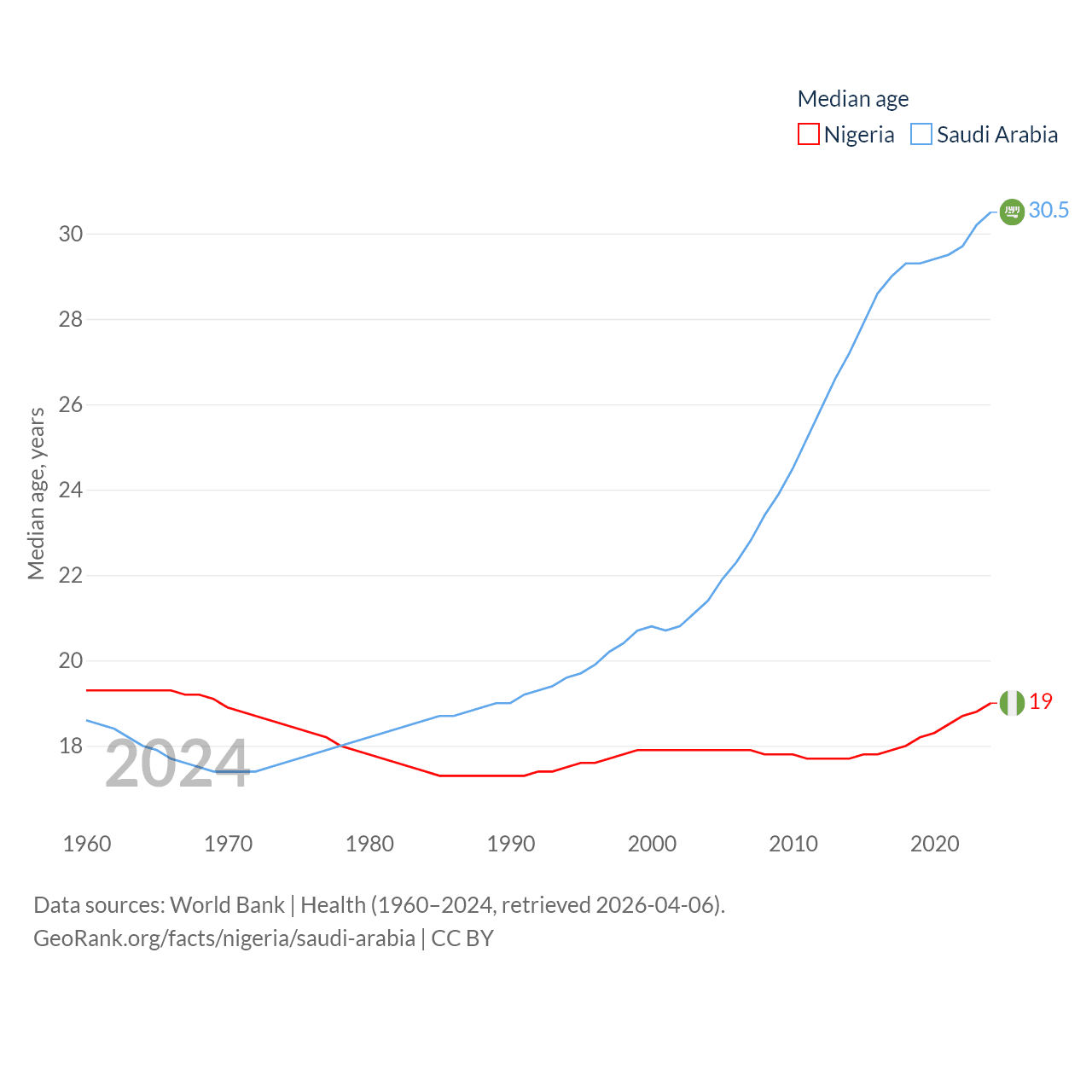 Nigeria has a population of 233M (ranked 6/197), compared with 35.3M in Saudi Arabia (ranked 45/197). Nigeria's land area is 351,650 sq mi versus 830,000 sq mi for Saudi Arabia (ranked 30th vs. 12th).