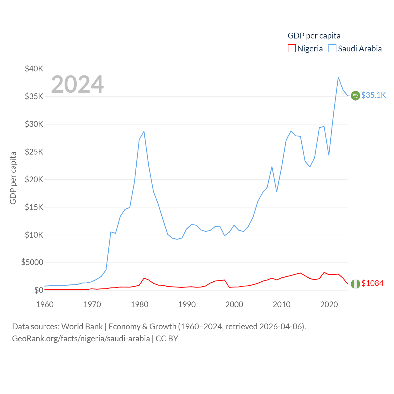 By GDP, Nigeria ranks 54/197 ($252B) and Saudi Arabia ranks 18/197 ($1.24T). By GDP per capita, Nigeria ranks 174/197 ($1,084), while Saudi Arabia ranks 33/197 ($35,122).