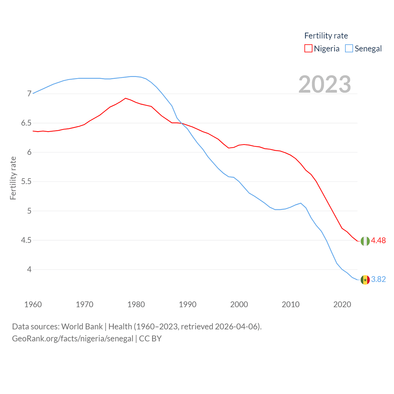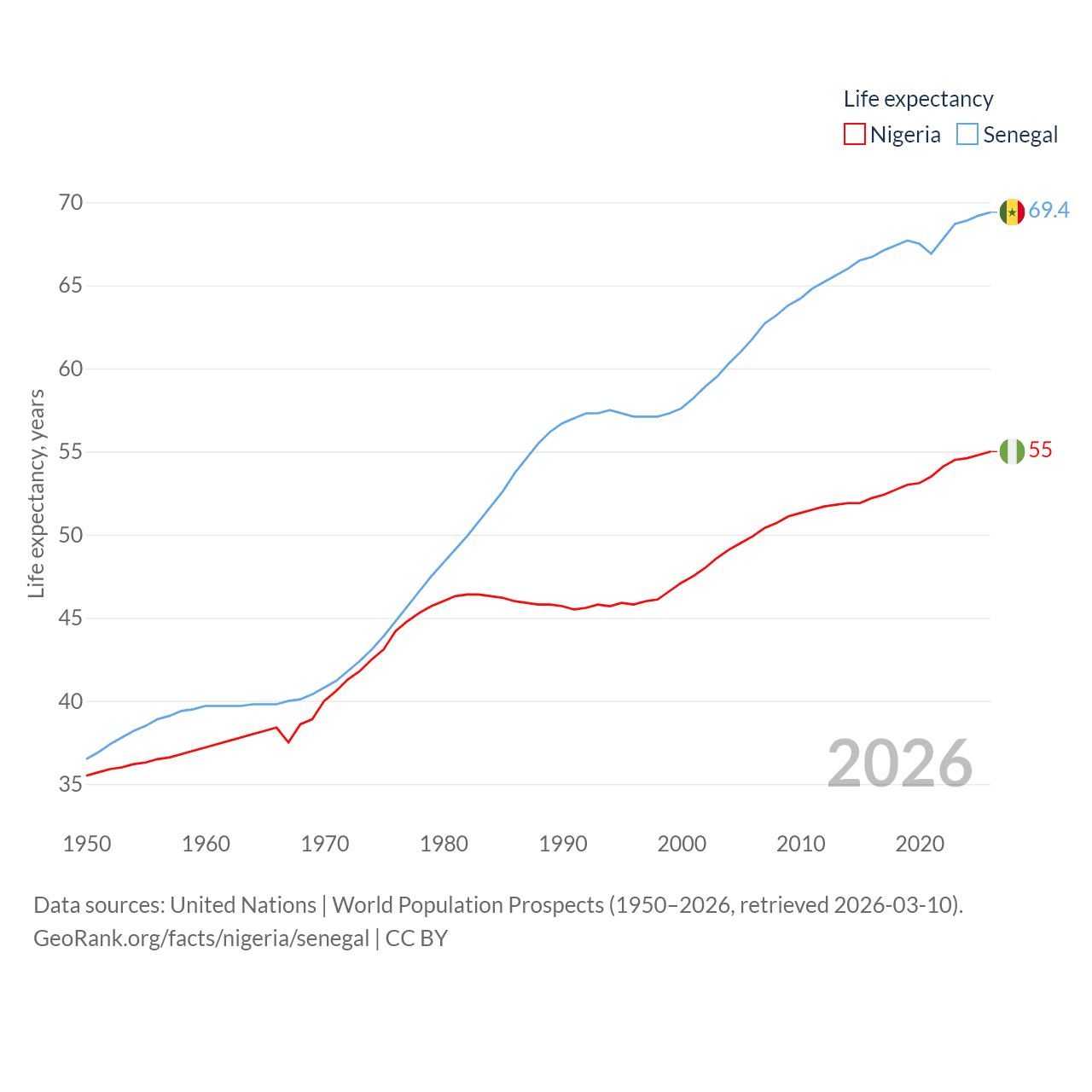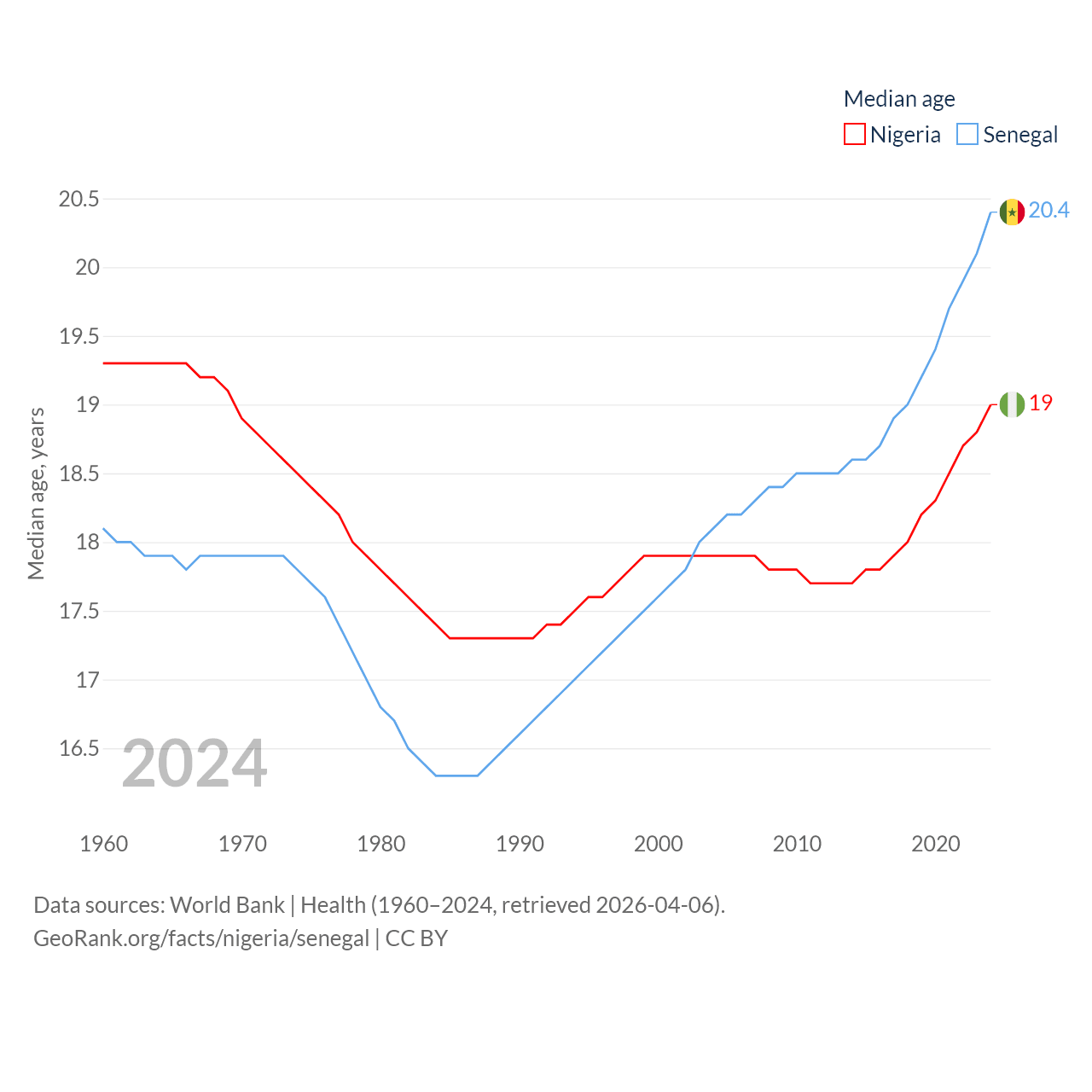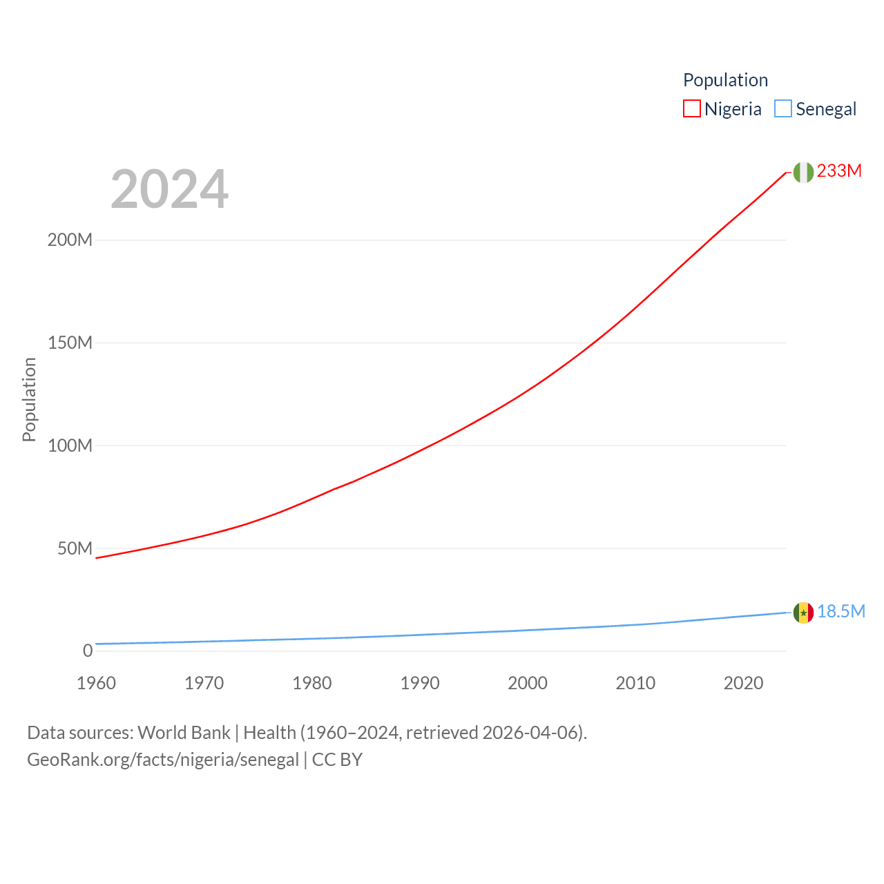 Nigeria has a population of 233M (ranked 6/197), compared with 18.5M in Senegal (ranked 69/197). Nigeria's land area is 351,650 sq mi versus 74,336 sq mi for Senegal (ranked 30th vs. 85th).