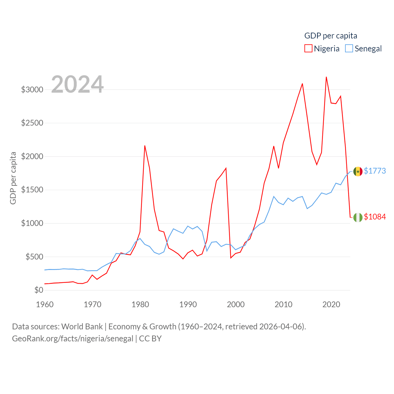 By GDP, Nigeria ranks 54/197 ($252B) and Senegal ranks 109/197 ($32.8B). By GDP per capita, Nigeria ranks 174/197 ($1,084), while Senegal ranks 159/197 ($1,773).