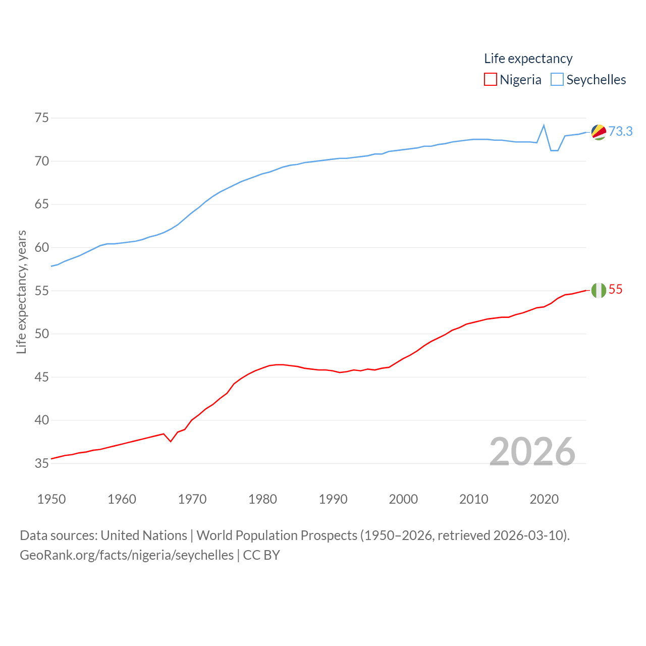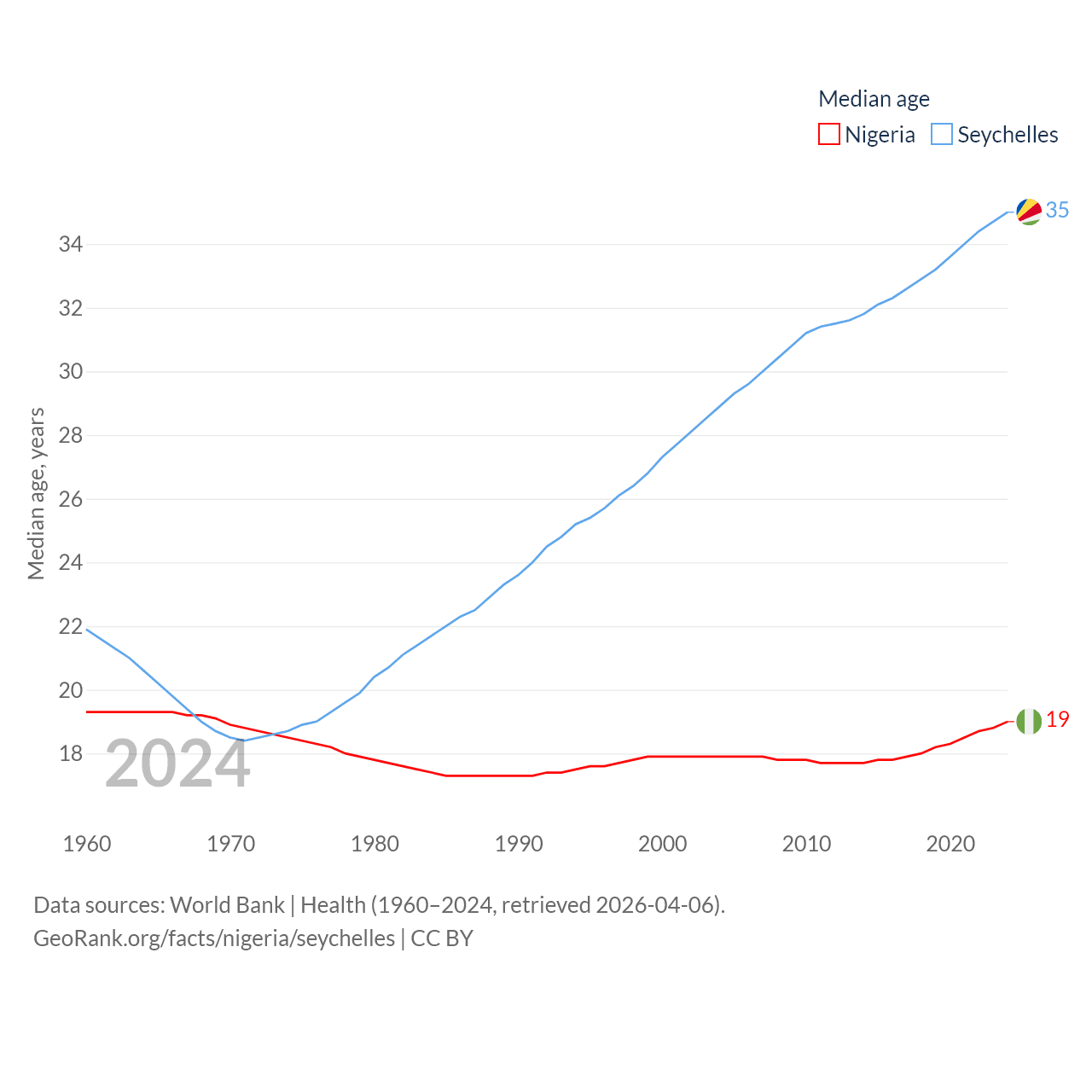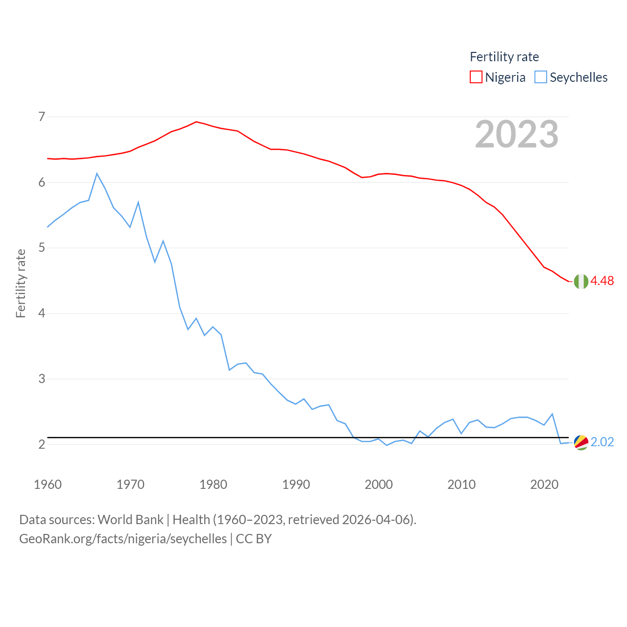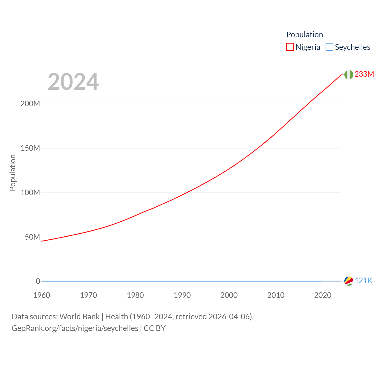 Nigeria has a population of 233M (ranked 6/197), compared with 121K in The Seychelles (ranked 181/197). Nigeria's land area is 351,650 sq mi versus 177.6 sq mi for The Seychelles (ranked 30th vs. 181st).