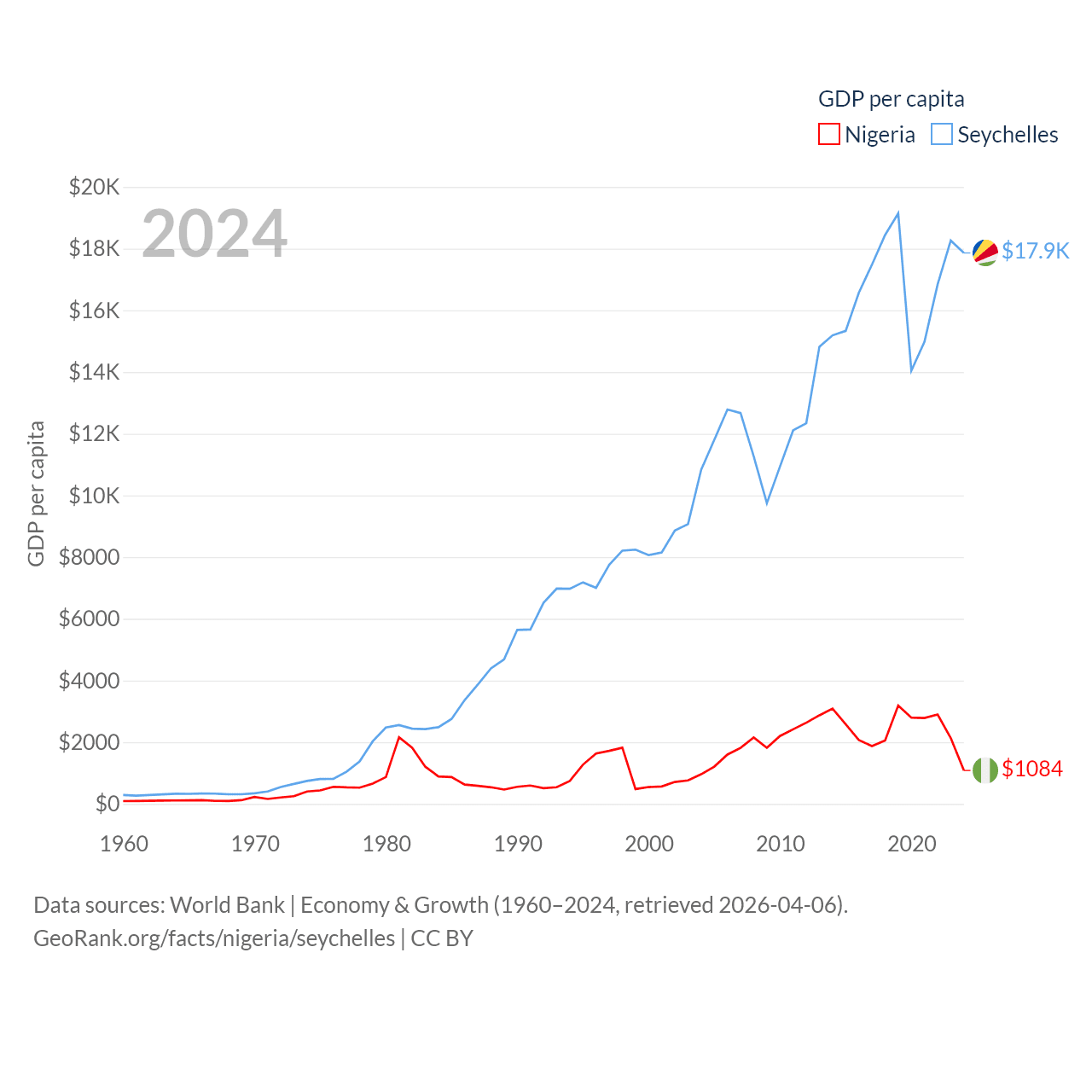 By GDP, Nigeria ranks 54/197 ($252B) and The Seychelles ranks 178/197 ($2.17B). By GDP per capita, Nigeria ranks 174/197 ($1,084), while The Seychelles ranks 63/197 ($17,859).