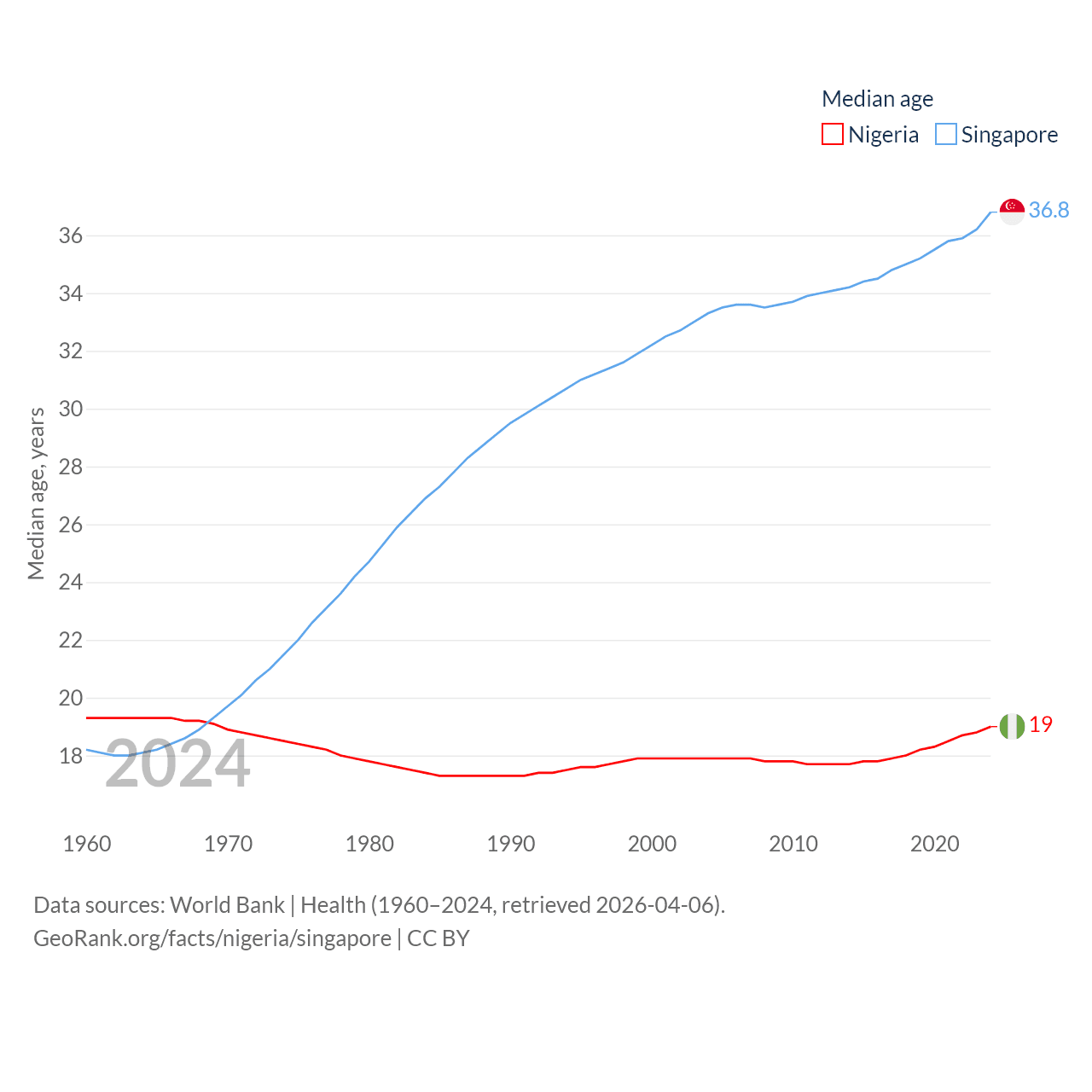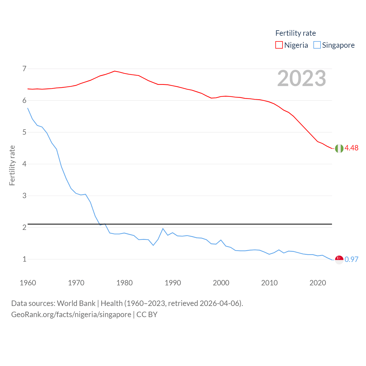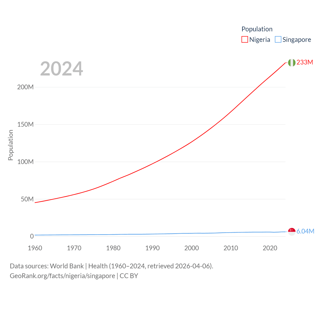 Nigeria has a population of 233M (ranked 6/197), compared with 6.04M in Singapore (ranked 113/197). Nigeria's land area is 351,650 sq mi versus 277.2 sq mi for Singapore (ranked 30th vs. 177th).