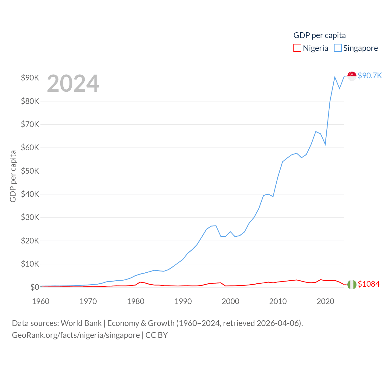 By GDP, Nigeria ranks 54/197 ($252B) and Singapore ranks 28/197 ($547B). By GDP per capita, Nigeria ranks 174/197 ($1,084), while Singapore ranks 7/197 ($90,674).