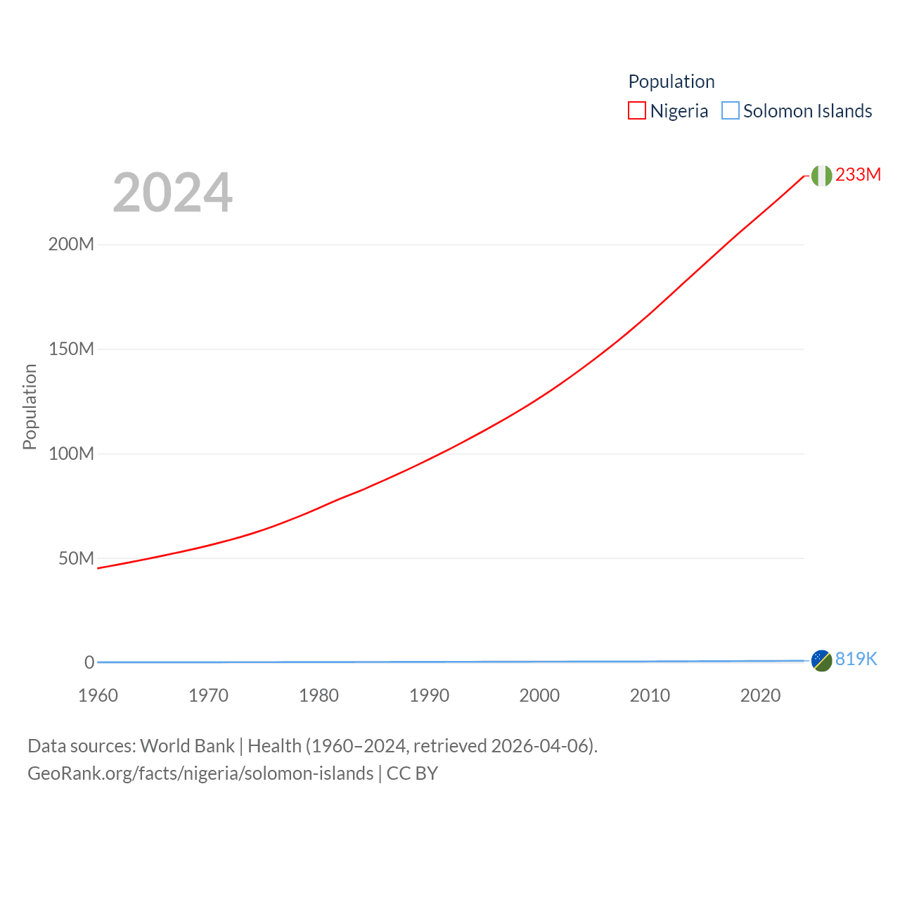 Nigeria has a population of 233M (ranked 6/197), compared with 819K in The Solomon Islands (ranked 162/197). Nigeria's land area is 351,650 sq mi versus 10,807 sq mi for The Solomon Islands (ranked 30th vs. 141st).