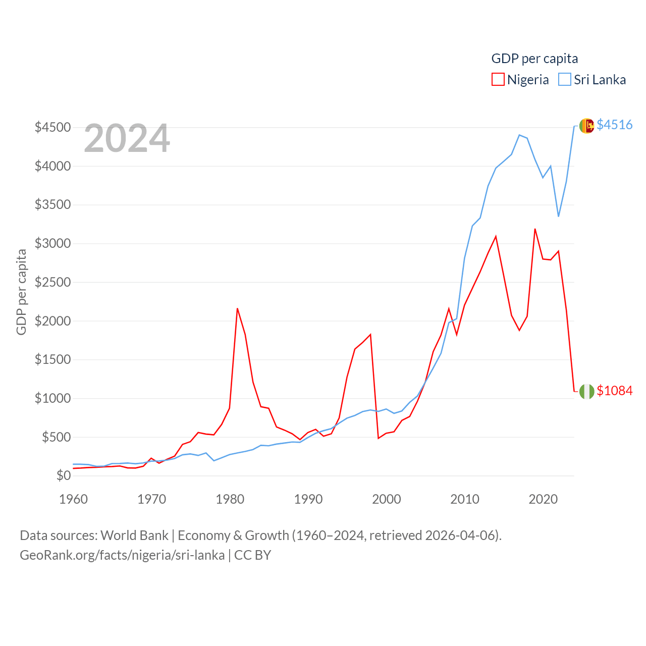 By GDP, Nigeria ranks 54/197 ($252B) and Sri Lanka ranks 72/197 ($99B). By GDP per capita, Nigeria ranks 174/197 ($1,084), while Sri Lanka ranks 124/197 ($4,516).