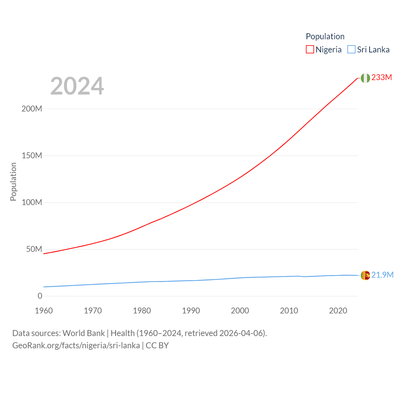 Nigeria has a population of 233M (ranked 6/197), compared with 21.9M in Sri Lanka (ranked 61/197). Nigeria's land area is 351,650 sq mi versus 23,884 sq mi for Sri Lanka (ranked 30th vs. 122nd).