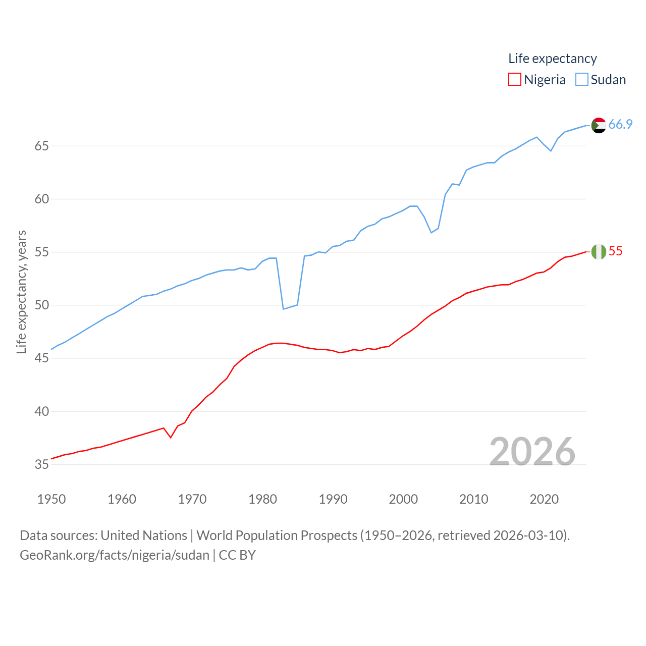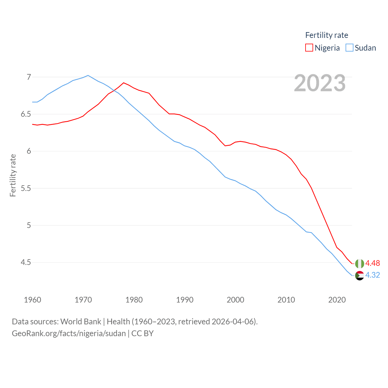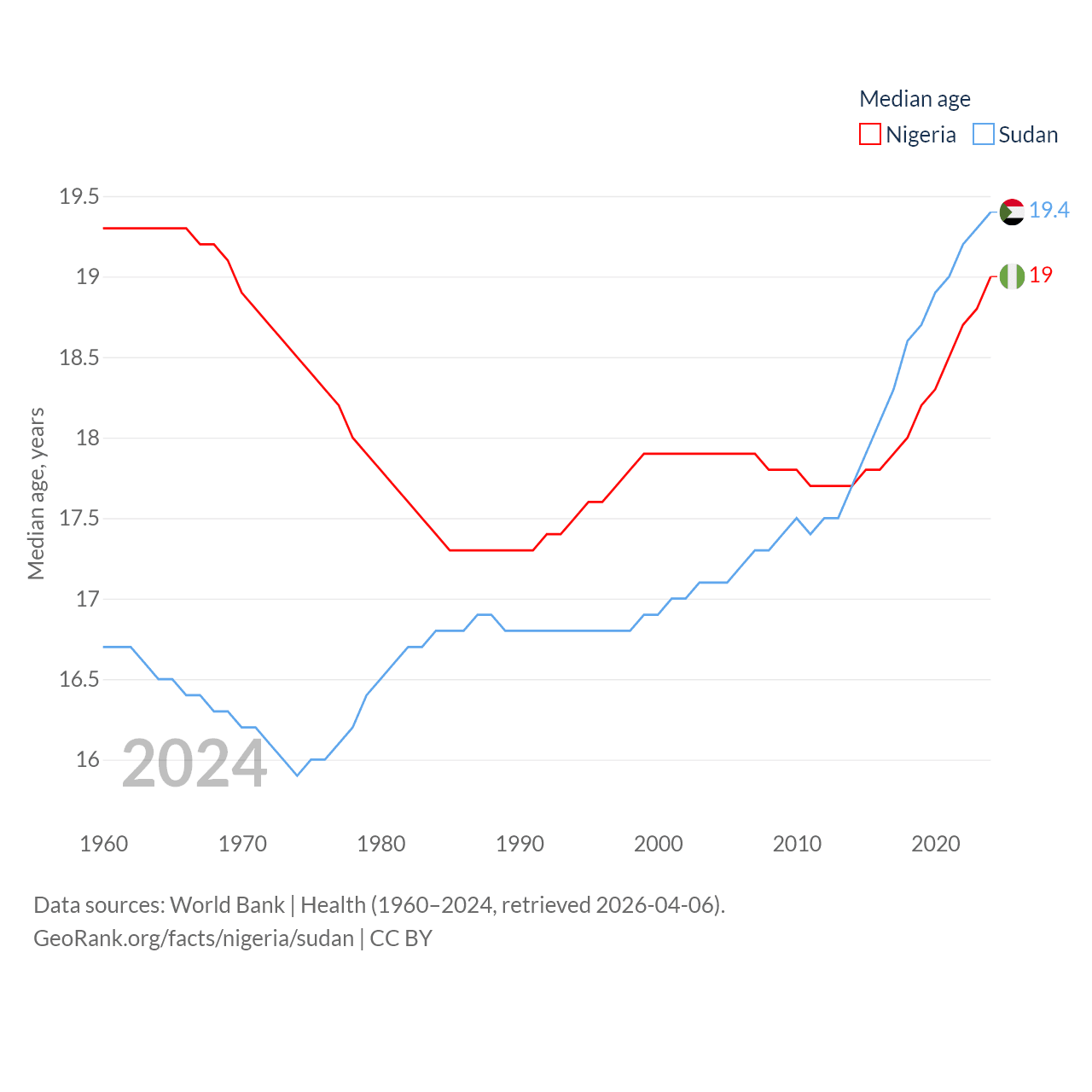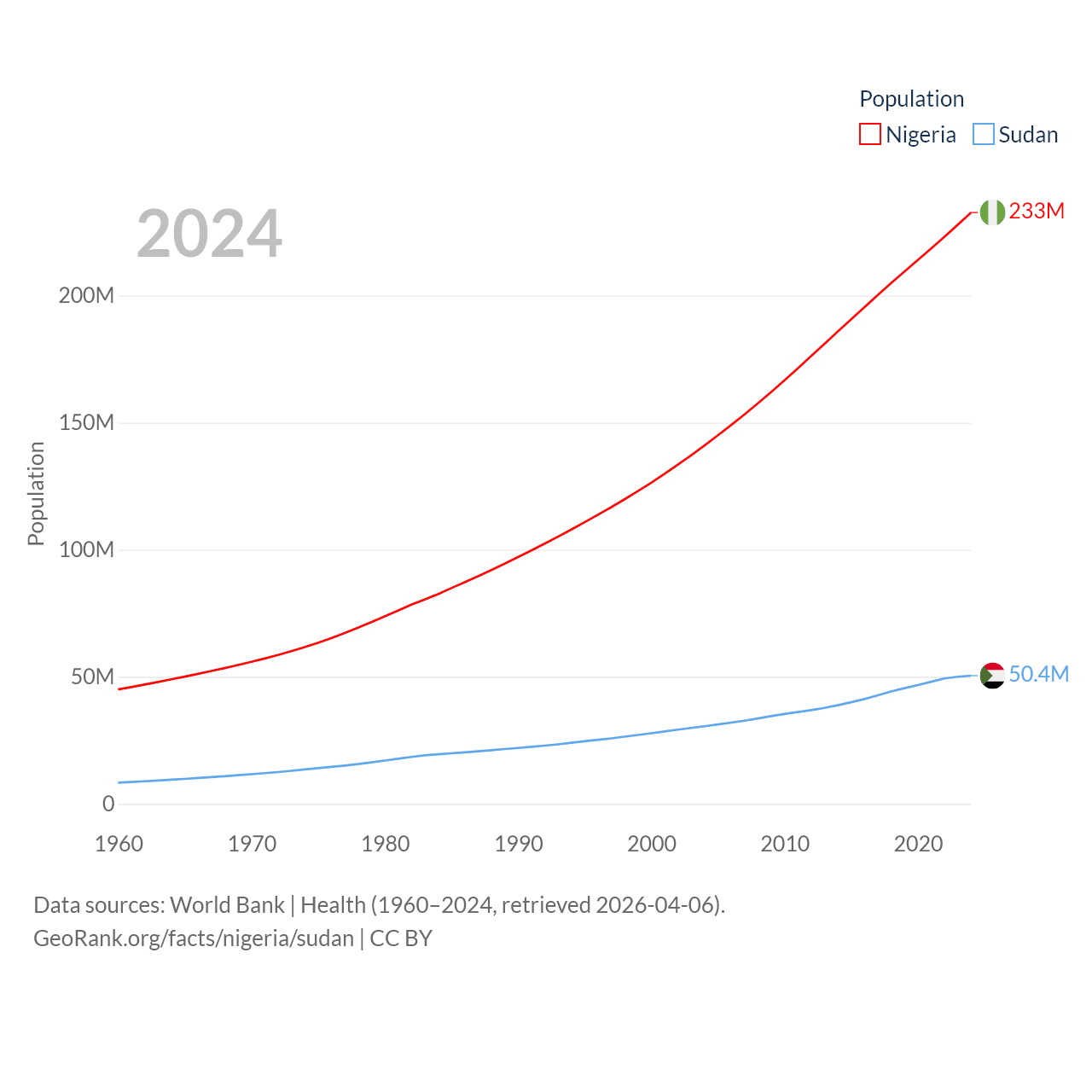 Nigeria has a population of 233M (ranked 6/197), compared with 50.4M in Sudan (ranked 30/197). Nigeria's land area is 351,650 sq mi versus 721,239 sq mi for Sudan (ranked 30th vs. 15th).