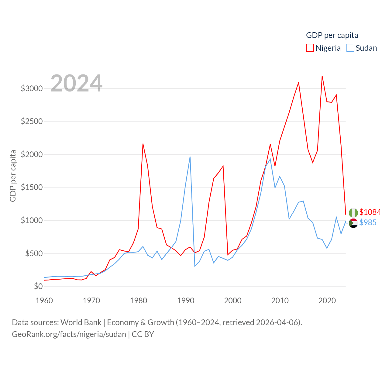 By GDP, Nigeria ranks 54/197 ($252B) and Sudan ranks 94/197 ($49.7B). By GDP per capita, Nigeria ranks 174/197 ($1,084), while Sudan ranks 179/197 ($985).